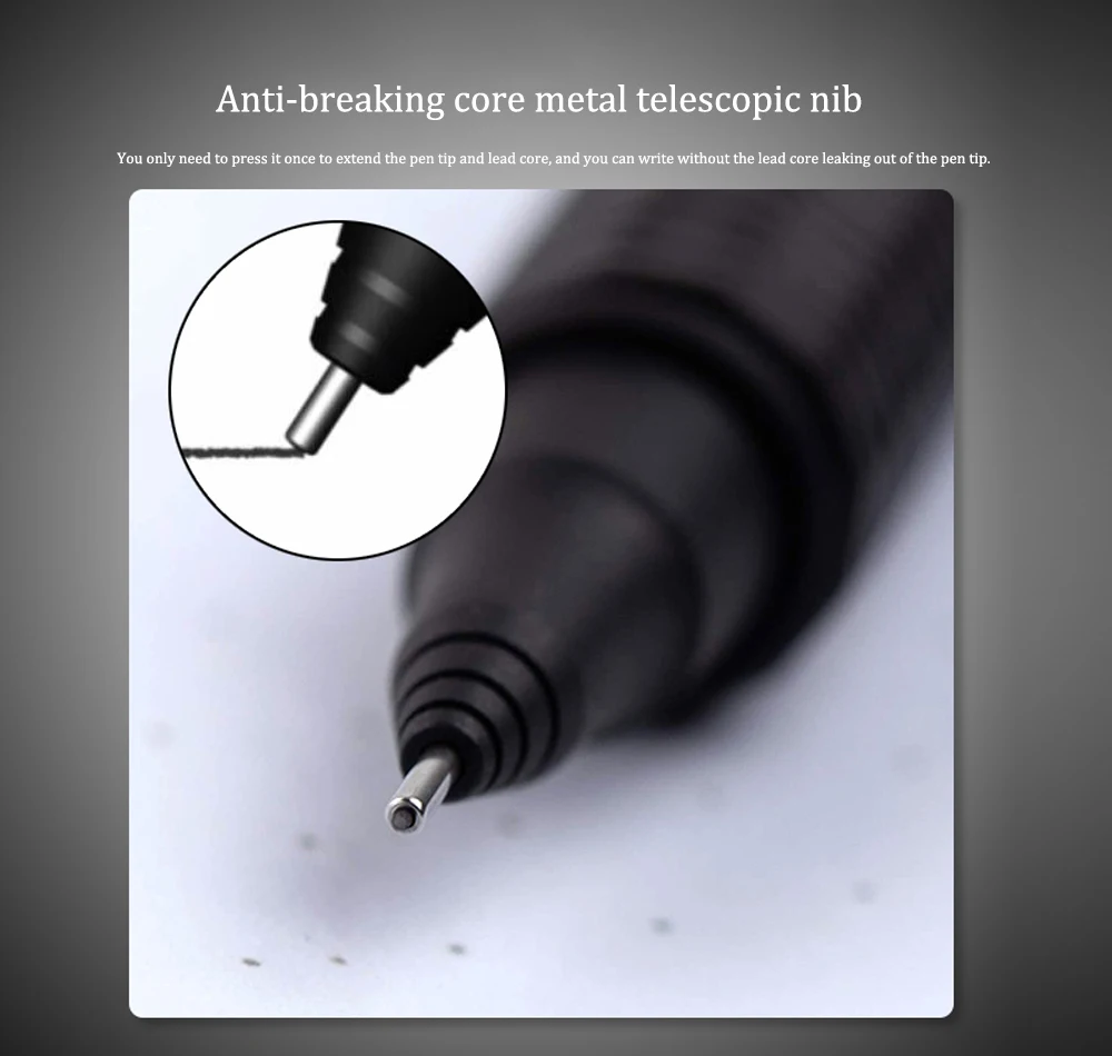 Автоматический карандаш для рисования, анти-сломанный металлический выдвижной наконечник, нужно только нажать один раз, чтобы продлить наконечник и привестиСвинцовое ядро может быть записано без выставления кончика ручки, и автоматический механизм вывода ядра может автоматически удлинить свинцовое ядро, когда зажим ручки покидает бумагу в процессе письма, не нажимая сноваВстроенная пружина наконечника обладает лучшим антиразрывным эффектом и может писать более свободно