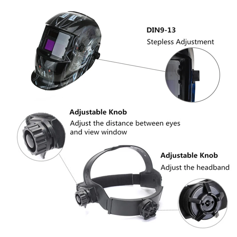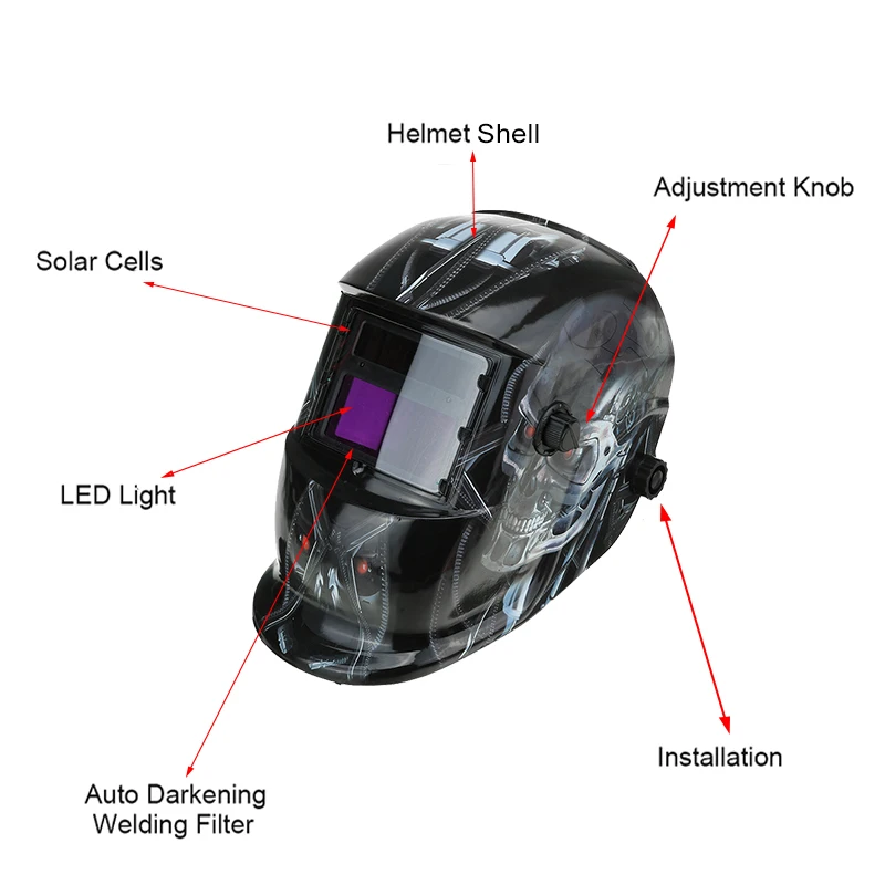 Характеристика:1. При ударе дуги автоматический затемняющий фильтр изменится от очищенного состояния до темного состояния, а время отклика составляет менее 1 / 1000 с.2. Автоматический сварочный шлем при нормальных условиях сварки, шлем защищает глаза и лицо от искры, брызг и вредного излучения.3. Литиевая батарея с запасной солнечной энергией.4. Достаточно пространства для маски и очень безопасная структура.5. Подходит для более высоких рабочих температур сварки.6. Варианты сварки или шлифования.7. Количество и чувствительность внешнего занавеса регулируются, что делает оператора более удобным в эксплуатации.8. Большой размер окна для удобного просмотра.9. Правая и левая руки могут выбрать подходящую лестницу.10. Когда светильник от сварщика обнаружен, авто затемняющий объектив автоматически тускнеет до выбранного номера теней.