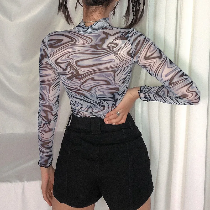 Сетчатый прозрачный кроп-Топ с длинным рукавом, футболка, женская модная Прозрачная облегающая футболка с принтом, Сексуальные клубные вечерние топы для женщин