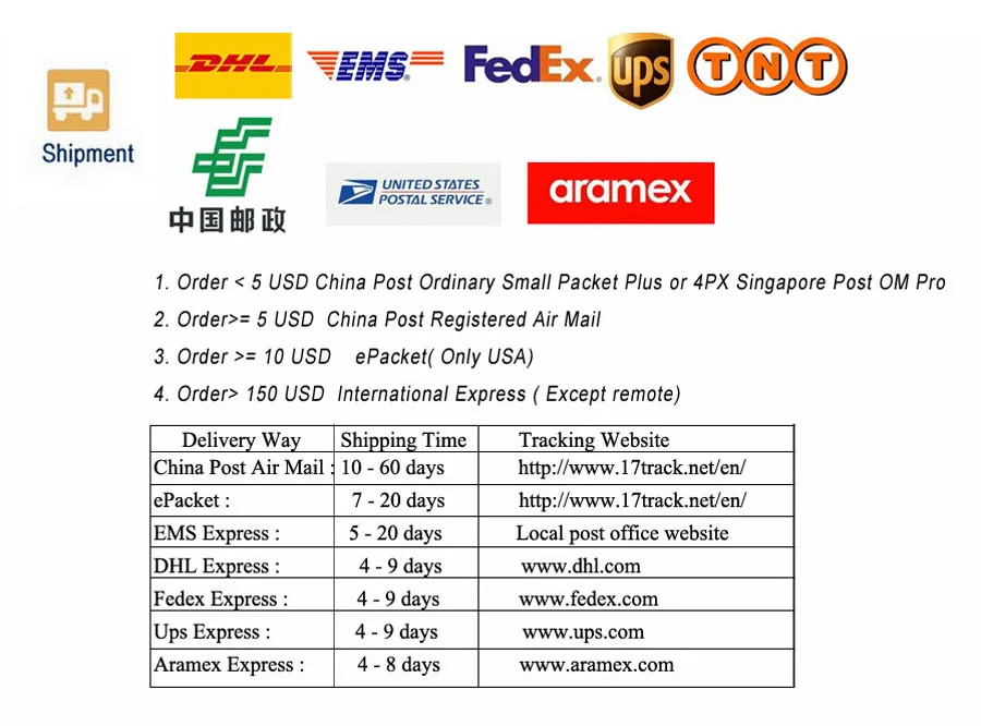 3) Если стоимость заказа превышает $150, ems Бесплатная доставка через DHL,EMS,Fedex,TNT экспресс-доставка.