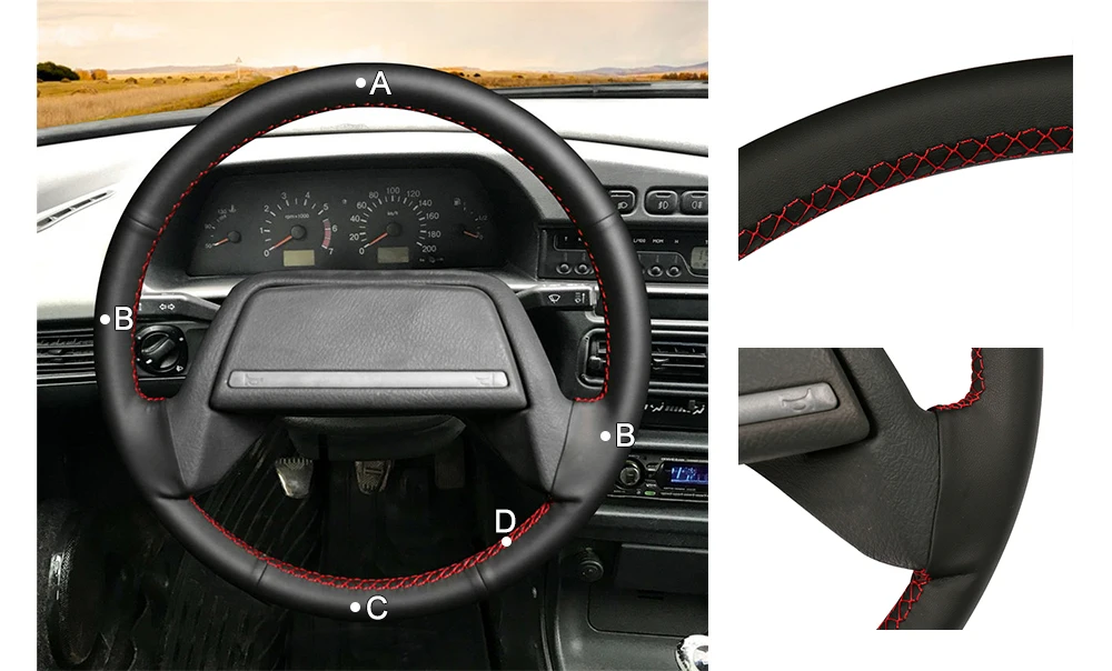 Сшитая вручную черная оплетка рулевого колеса из искусственной кожи...