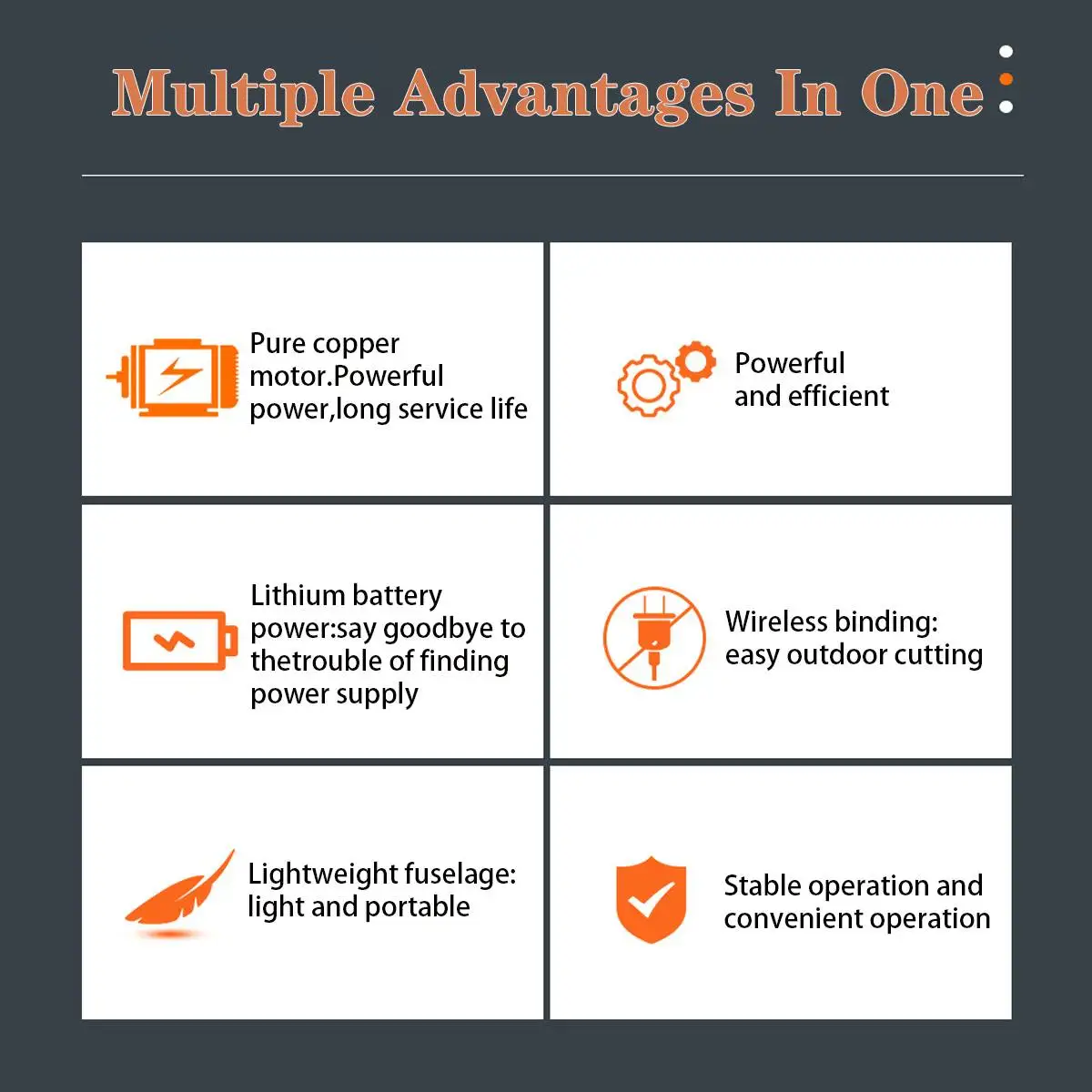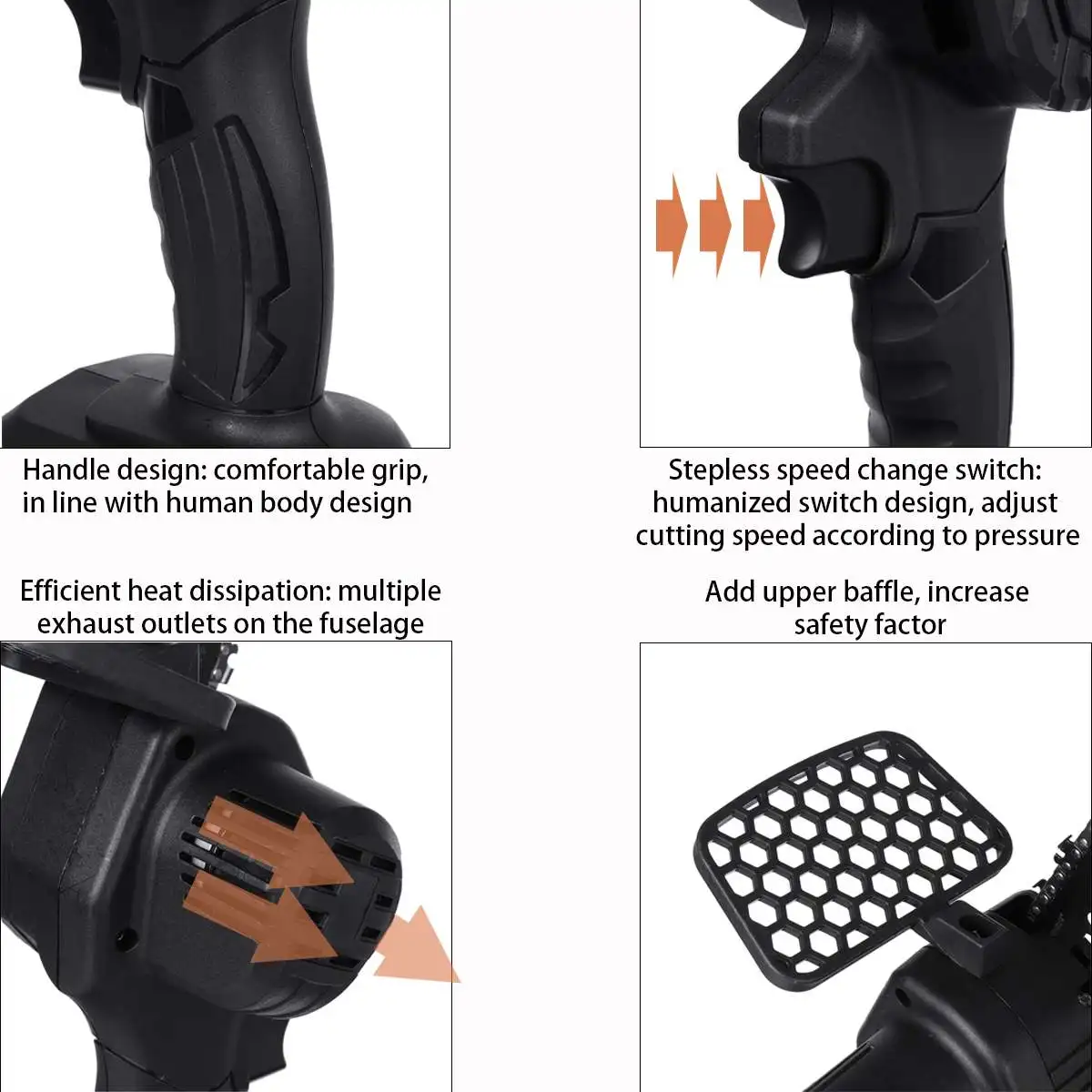Особенности:-Беспроводная Привязка: Легкая наружная резка-Двигатель из чистой меди: 550 Вт, мощная мощность, длительный срок службы-Электрическая пила для обрезки: Добавьте верхний дефлектор, увеличьте коэффициент безопасности-Дизайн ручки: удобный захват, в соответствии с дизайном человеческого тела-Мощность литиевой батареи: Попрощайтесь с проблемой поиска источника питания-Простота в использовании: Нет необходимости разбирать, поверните винт, чтобы отрегулировать герметичность цепи-Высококачественная направляющая цепь: острая износостойкая, глубокая закалка более износостойкая, гладкая резка-Плавное переключение скорости: гуманизированный дизайн переключателя, регулировка скорости резки в соответствии с давлением-Эффективное рассеивание тепла: конструкция нескольких выпускных выходов на фюзеляже может эффективно предотвратить горение-Светильник весовой фюзеляж: светильник, портативный, с одной рукой, удобно держать, не уставать, чтобы держать в течение длительного времени-Четыре интеллектуальных функции защиты: защита от перегрузки по току, защита от перенапряжения, защита от перегрева, защита от зарядки и разрядки, автоматическое отключение высокого тепла