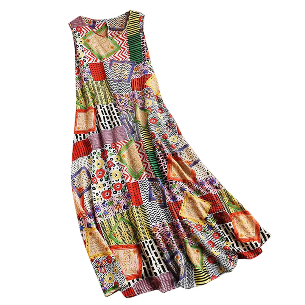 Женский винтажный летнее платье сарафан-Кафтан без рукавов с цветочным принтом, пляжный сарафан в богемном стиле, размера плюс