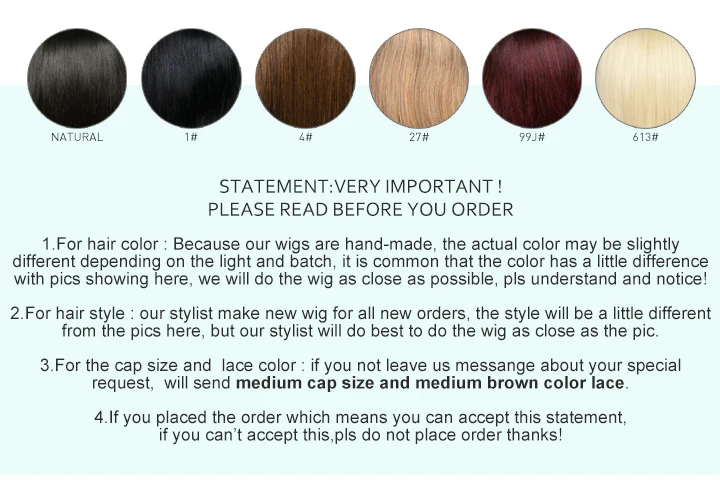 1. Для цвета волос: Потому что наши парики целиком ручная работа, фактический цвет изделия на фото может быть s светильник ly отличается в зависимости от того, светильник и партии, он является общим, что цвет немного отличается от фотографии здесь, может быть Немного темнее или светлее, мы сделаем цвет как можно ближе, но небольшая разница в цвете нормальная, пожалуйста, поймите и обратите внимание! Можете связаться с продавцом, чтобы получить больше реальных фотографий перед заказом.2. Для прически: наш самый стильный новый парик для всех новых заказов, стиль будет немного отличаться от изображений здесь, но oyr styliest сделает все возможное, чтобы сделать парик так же близко, как на картинке.3. Для размера шапки и цвета кружева: если вы не оставите нам сообщение о вашем особом запросе, мы отправим Средний размер шапки и средней длины коричневого цвета кружева по умолчанию. Специальный цвет шнурка, размер крышки или более высокая плотность можно связаться с продавцом для того чтобы подгонять.4. Если вы разместили заказ, что означает, что вы можете принять это заявление, если вы не можете принять это, пожалуйста, не размещайте заказ, спасибо!