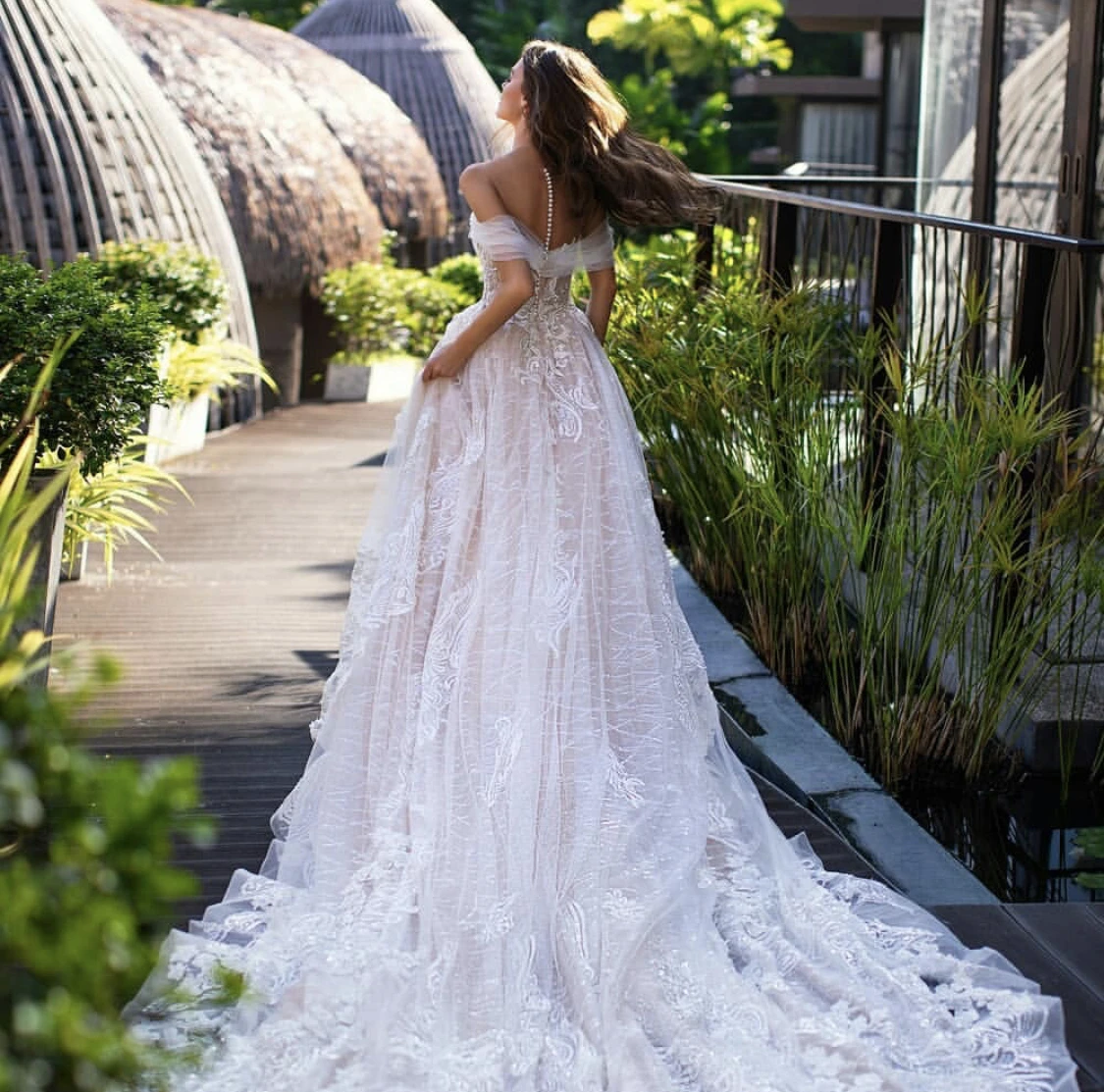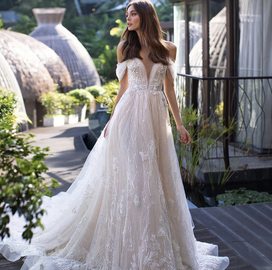 Великолепное свадебное платье 2021 А-силуэта с открытыми плечами кружевные аппликации блестки жемчужные пуговицы свадебное платье со шлейфом Свадебные платья