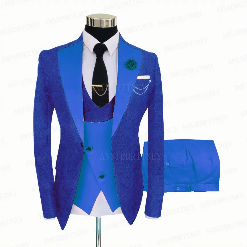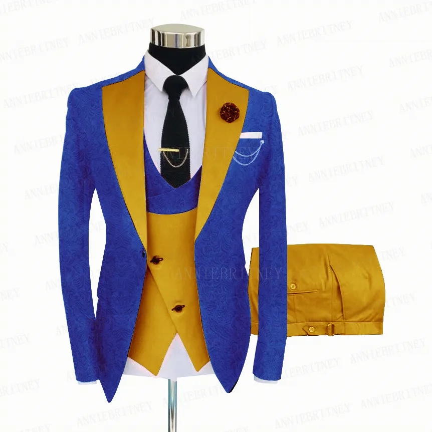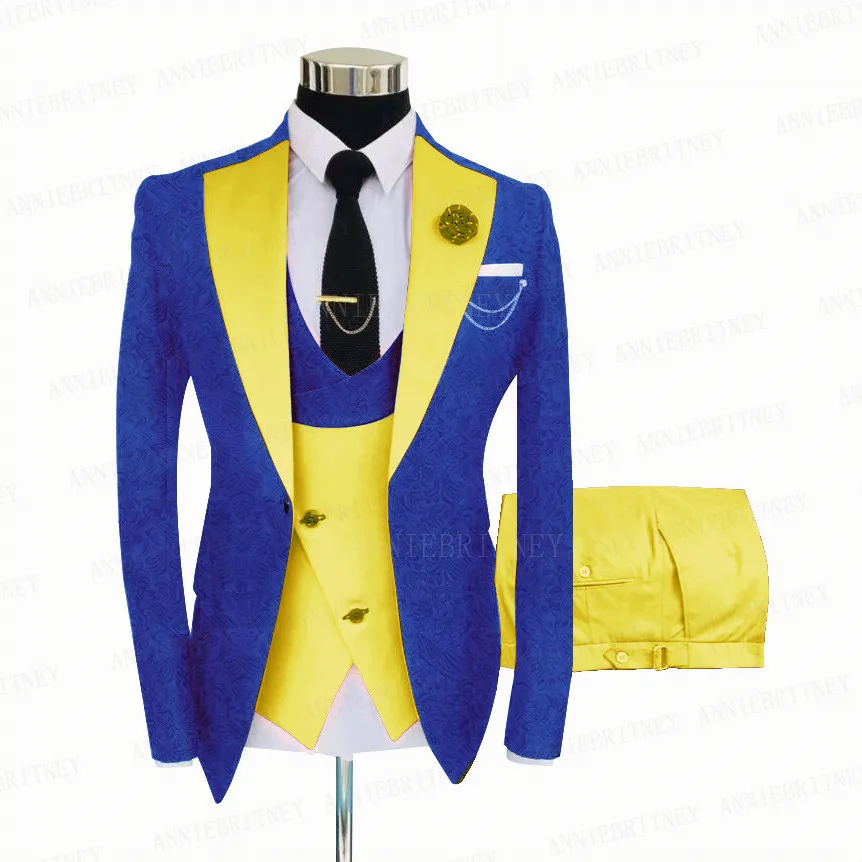 Мужской Жаккардовый смокинг, Темно-Синий Облегающий костюм из 3 предметов, жаккардовый пиджак, желтая жилетка и брюки, для свадьбы