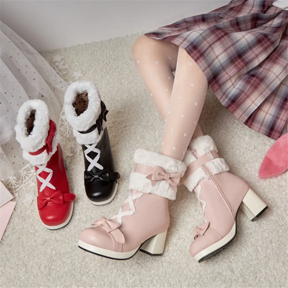 --- Стиль 4 --- милые теплые плюшевые зимние сапоги в стиле Лолиты с милым бантомВысота каблука: около 5,5 см (ошибка-1-1 см)Высота платформы: около 1,5 см (ошибка-1-1 см)Цвета: черный, розовый, красныйСезон: весна, осень, зимаМаленькие Большие размеры: 28,29,30,31,32,33,34,35,36, 37, 38, 39 ,40,41,42,43