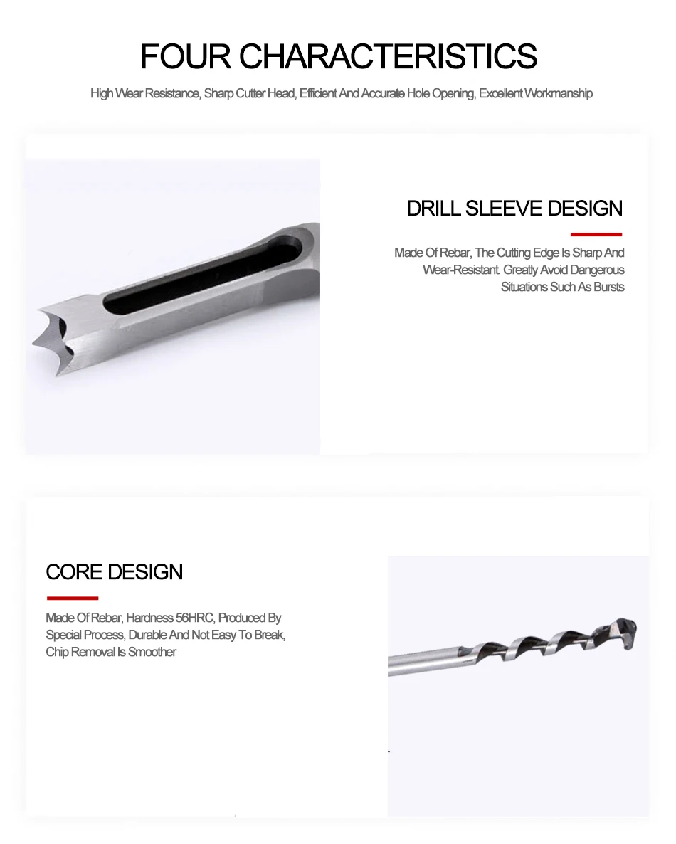 Особенности: 1. Материал арматуры 2. Дизайн рукава сверла 3. Конструкция бурового сердечника 4. Дизайн режущей кромки 5. Дизайн стружки Спецификация: Диаметр: 6-30 мм Рабочая глубина: 40-75 мм Материал: арматура Диапазон использования: В основном используется для столярных работ, красного дерева, дерева, ДСП, плит плотности и других буровых работ Адаптационная машина: Квадратное сверло для глаз (не подходит для ручных сверл, ручных сверл)