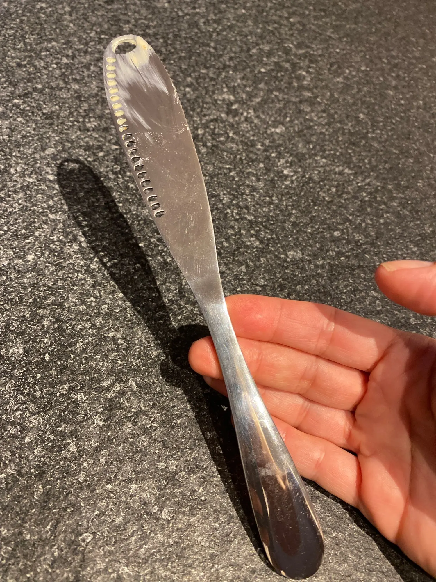 ножик зачётный. немного не удобно намазывать масло на хлеб( масло в дырочках застревает) или привыкнуть надо. вобщем зачёт.