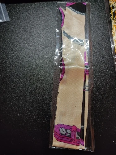 Я выиграл случайную модель, цвета яркие, а материал блестящий. Для длины это соответствует тому, что указано, это недостаточно долго, чтобы положить его в ремень. Я все еще рекомендую этот продукт, чтобы положить в волосы или на сумку.