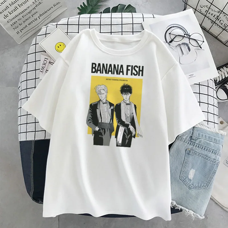 Летняя Повседневная Свободная футболка с аниме бананами и рыбками, Женская Милая футболка в стиле панк с пышной рыси, уличная одежда в стиле Харадзюку, Женский Топ с коротким рукавом, манга