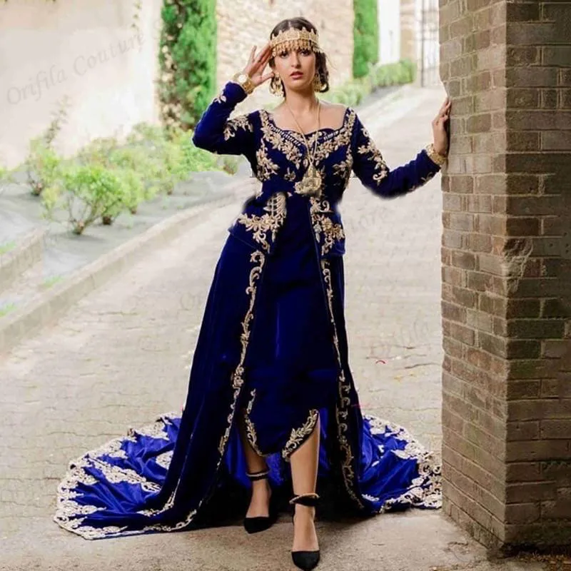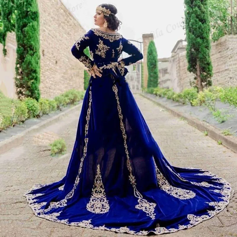 Ярко-синее алжирское вечернее платье Caftan, Марокканское бархатное платье с длинным рукавом, баской, кружевной наряд с золотой аппликацией, наряды для выпусквечерние вечера