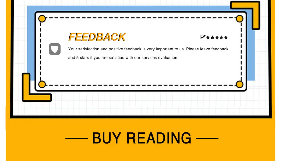 1. Раннее Подтверждение покупателя будет высоко оценено после получения товаров. 2. Поскольку ваши отзывы очень важны для развития нашего бизнеса, мы искренне приглашаем вас оставить нам положительные отзывы, если вы удовлетворены нашим продуктом и обслуживанием. Это займет всего 1 минуту, но эта 1 минута имеет чрезвычайно важное значение для нас. 3. Пожалуйста, свяжитесь с нами, прежде чем оставить отрицательный или нейтральный отзывы. Мы будем работать с вами, чтобы решить любые проблемы.