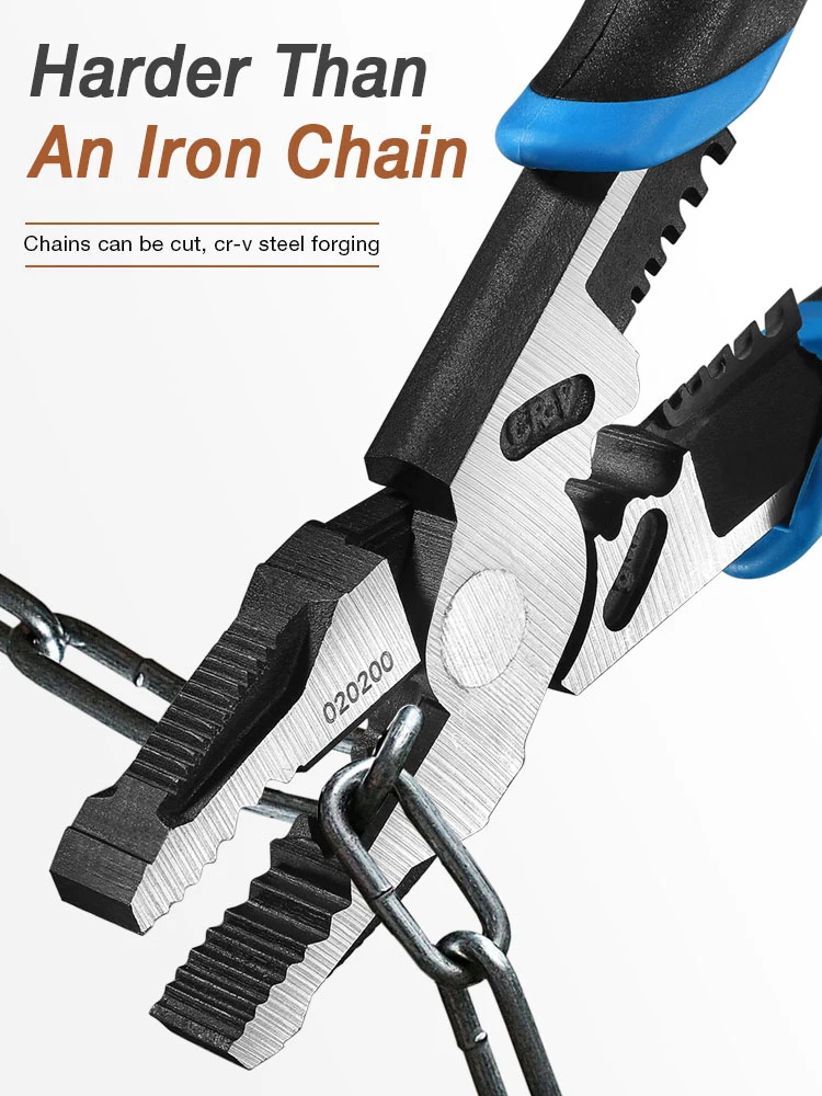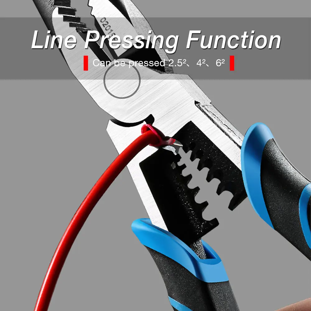 1. Противоскользящая ручка 2. Функция зачистки, закручивание лезвия, вы можете удалить регулировочный зазор 3. Обжимной паз, вы можете выполнить простую функцию резца провода 4. Экономьте энергию, чтобы легче резать 5. Резка Проволоки, функция зачистки проволоки 6. Плоскогубцы с длинным носом, симметричная головка с зажимом, Функциональные зубы чисты, удерживая предметы таким твердым. Края, двойная термическая обработка, Режущий эффект более совершенный 7. Диагональные плоскогубцы, деликатные острые, режущие силы сильнее 8. Плоскогубцы, Зажимная головка симметричная, функциональные зубы чистые, держа предметы с таким твердым. Края, двойная термическая обработка, Режущий эффект более совершенный