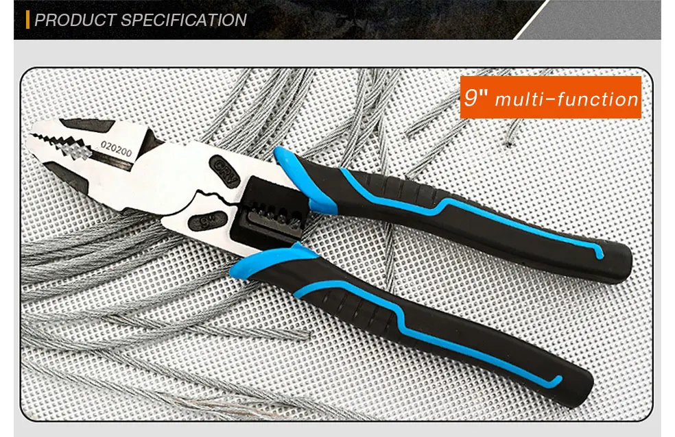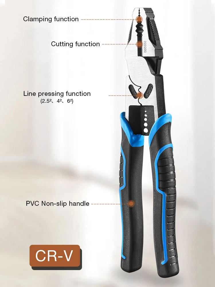 1: Может использоваться в качестве гаечного ключа 2: функция линии нажатия: может быть pressed2.5 ²,4 ²,6 ² 3: функция зачистки: пилинг 1,5 ², 2,5 ²,4 ²,6 м², 8 м² 4: крепкое сцепление: Зажимная головка может держать цементный гвозди, может использоваться в качестве зажима насоса 5: ножницы Функция: он может отрезать 1 мм и 3 мм стальной трос 3-дюймовых гвоздей 6: может быть скручен прямой провод, тройной провод, чем обычный зажим плотнее 7: non-slip PVC environment-friend Ручка