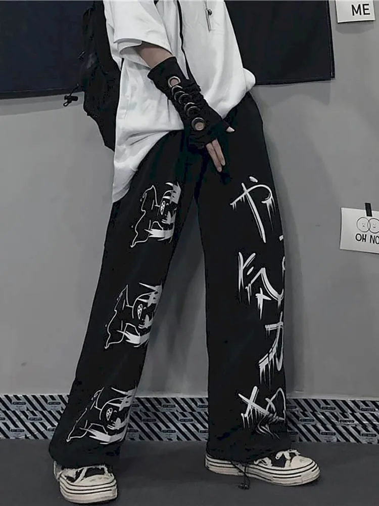 Женские брюки в стиле аниме, черные брюки с широкими штанинами, прямые, с высокой талией, большого размера