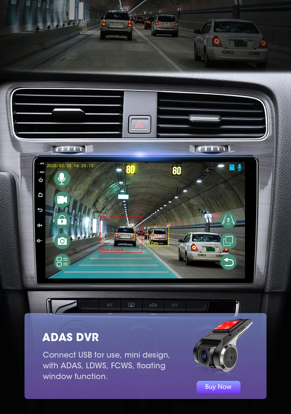 Поддерживает подключение к видеорегистраторУ ADAS. ADAS DVR имеет несколько встроенных ассистивных технологий вождения, вставляя высококачественную карту памяти TF для записи каждого момента вашего вождения.