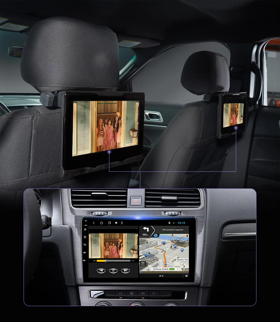 Основной драйвер использует навигацию по карте на левом экране, а второй пилот или задний ребенок (через видеовыход) наблюдает за любимой телевизионной программой на правом экране.