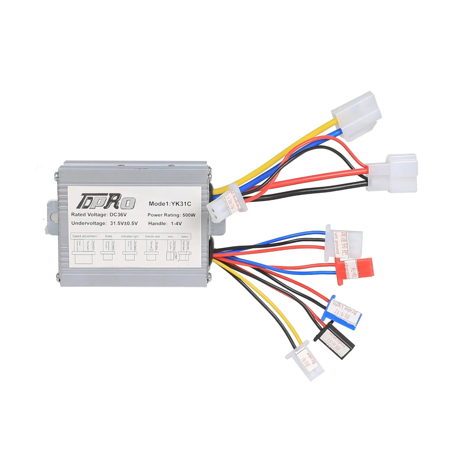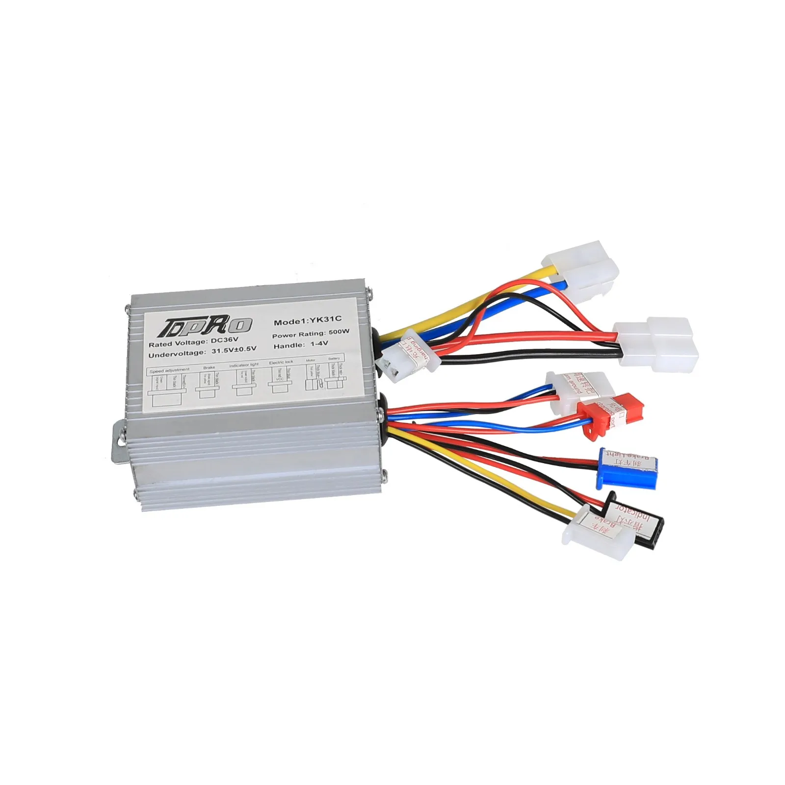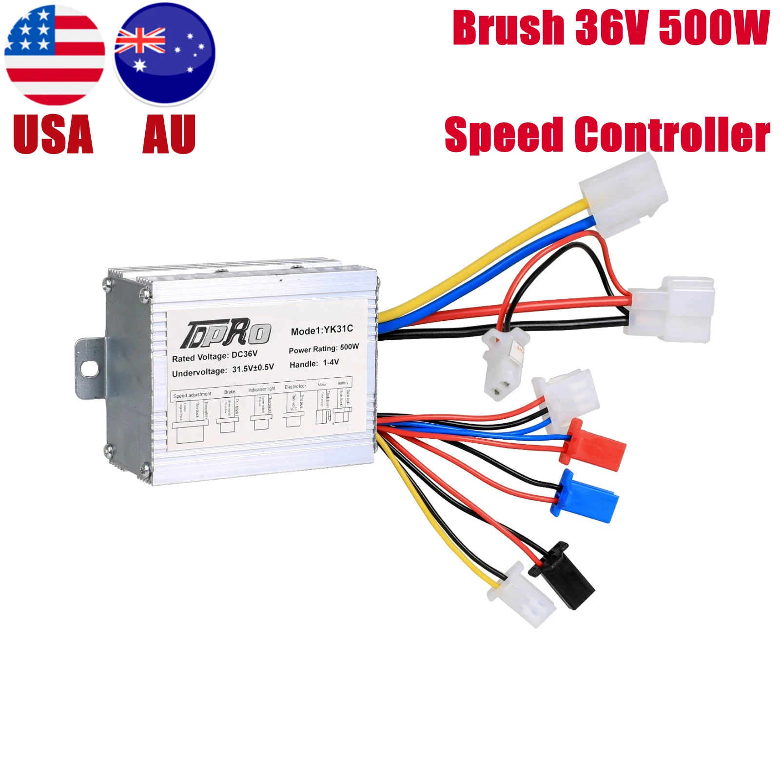 36V 500W мотор щеткой Скорость контроллер коробки Параметры● Красный и черный (большой кабель): подключение батареи● Желтый и синий: соединения двигателя● Красный и синий: клавишный переключатель (Блокировка питания) (если нет замков питания, красное соединение с синим)● Желтый и черный: тормоз● Красный и желтый: тормозной светильник● Красный и черный (маленький кабель): световой светильник● Красный, черный и синий: регулятор скорости 1-4 в (дроссельная заслонка) (красный: + 5 В, черный: - , синий: сигнальный провод)● Красный и черный (маленький кабель): зарядное устройство