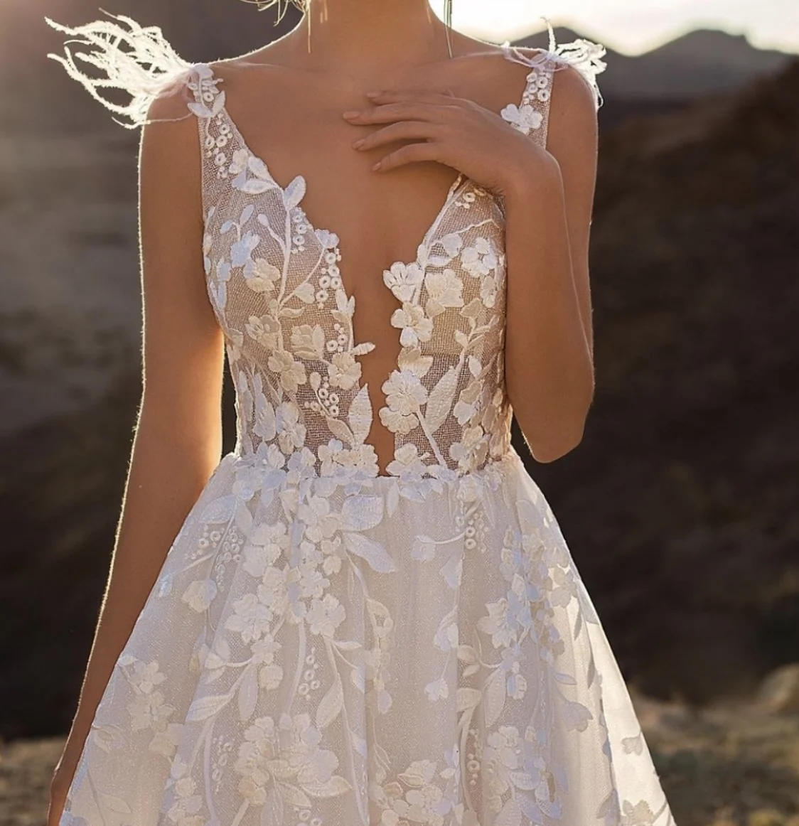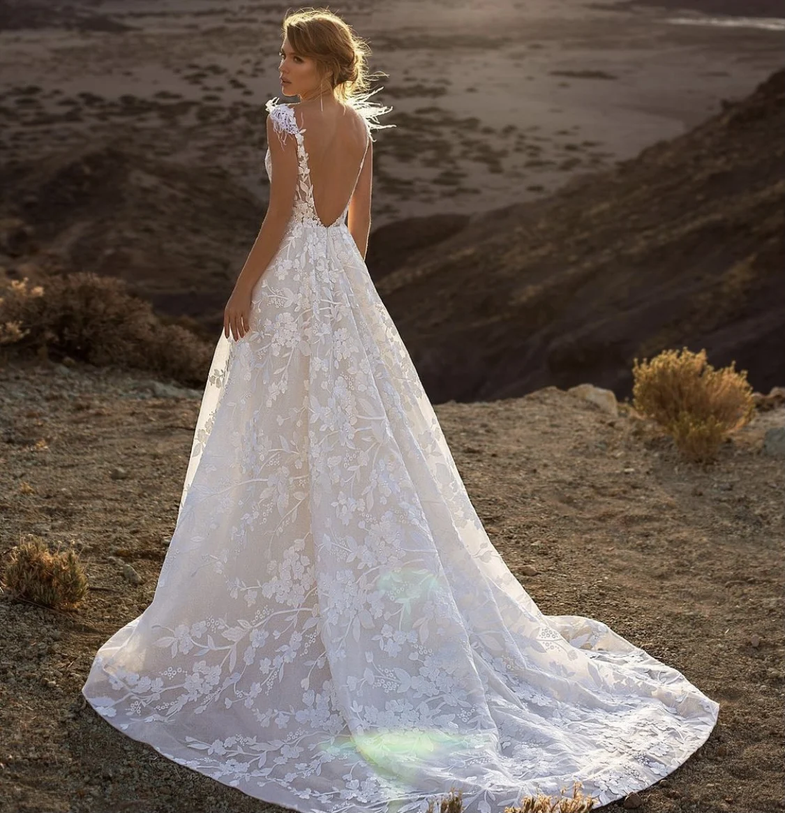 Роскошные свадебные платья 2021 трапециевидной формы из прозрачной ткани Перья Кружева Аппликации с открытой спиной развертки поезд невесты Vestidos De Noiva