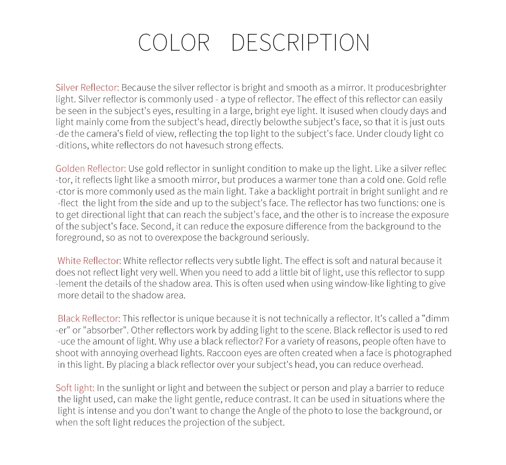 TСеребристая сторона очень отражающая и осветляет как тени, так и высокий светильник s, но не меняет цвет доступного светильник.
