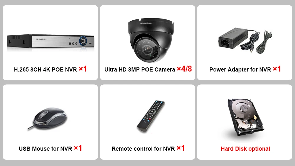 1 сетевой видеорегистратор 8CH 4K POE NVR;4/8 X HD POE IP 8.0MP Крытый Открытый ИК День ночного видения атмосферостойкие камеры;1 X Блок питания для NVR;1 х USB мышь для NVR;1 компакт-диск программного обеспечения для NVR;1 пульт дистанционного управления для NVR;Жесткий диск опционально!
