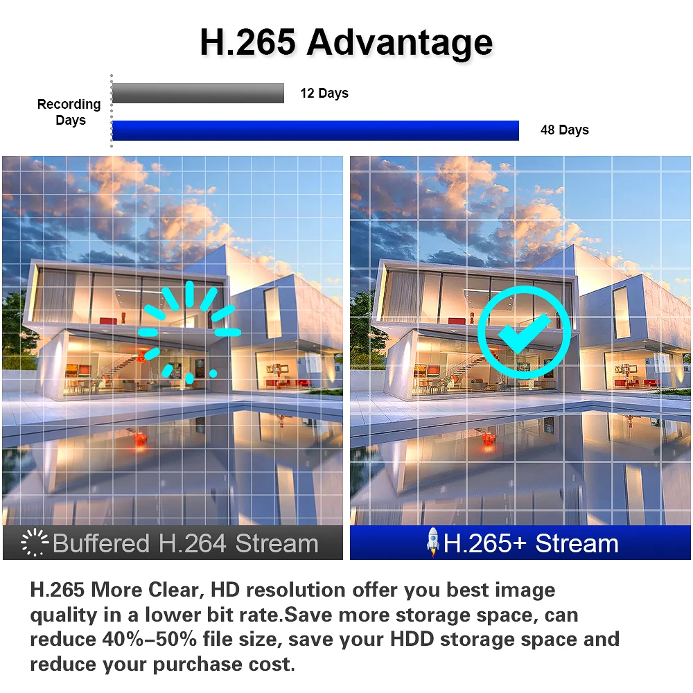 H.265 более четкий, HD разрешение предлагает вам лучшее качество изображения в более низкой скорости. Экономьте больше места для хранения, вы можете уменьшить размер файлов 40%-50%, сэкономить место для хранения HDD и снизить стоимость покупки.