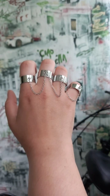 Кольца очень клёвые. Быстро пришли, были прекрасно упокованны. Все соответсвует описанию. Только имейте ввиду, что цепи не очень длинные, а сами кольца размером с большой, указательный, средний и безымянный палец. Кольца регулируются, так что всё ок. Всем добра