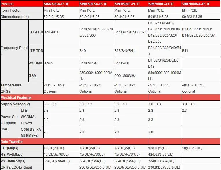 Серия SIM7600 принимает форм-фактор LCC1 и совместима с сериями SIM5320/SIM5360 (модули UMTS/HSPA +) и SIM7600/SIM7600-H (модули LTE), что обеспечивает плавный переход от 3g-продуктов к LTE продуктам и значительно облегчает более совместимый дизайн продукта с потребностями клиента.