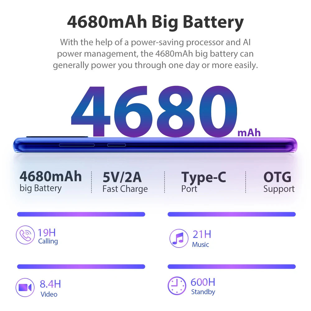 ОС: Android 10ЦП: Mediatek Helio A25, 12nmSIM: 2 Nano SIM (или 1 Nano + 1 TF)Батарея: 4680 мАчПамять: 4 Гб ОЗУ + 64 Гб ПЗУWIFI: IEEE 802.11b/g/n /acДисплей: 6,49 дюйма 720*1560 пикселей, 19:9Тыловая Камера: 13 МП + 2 Мп + 0,3 Мп + 0,3 МПФронтальная камера: 8MP
