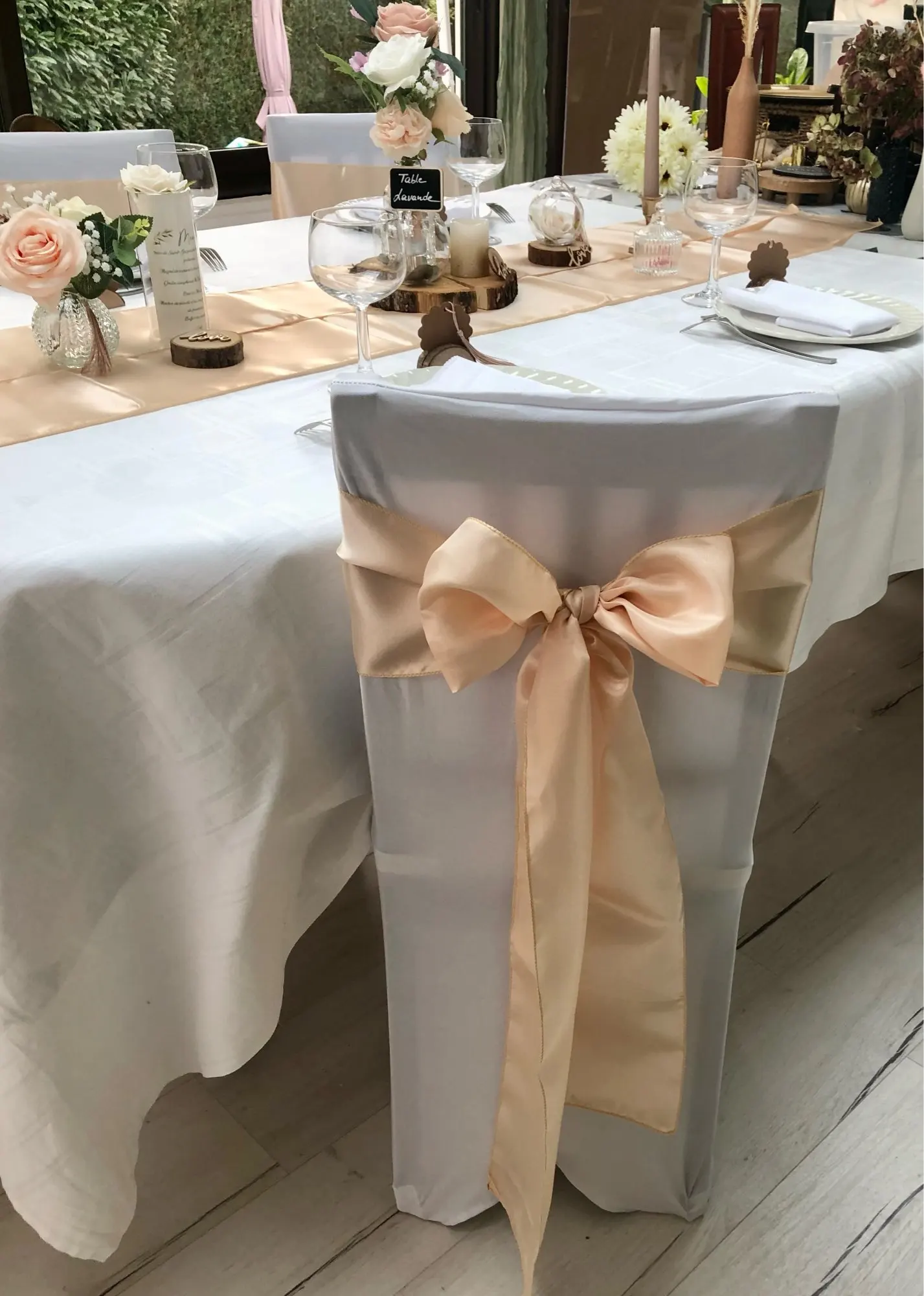 Добавьте стиль к своим стульям для любых вечерние мероприятий с этими атласными лентами для стульев. Изготовлен из тонкого атласа с готовым краем. Эти полностью сшитые ленты для стульев можно также использовать на церковных петлях, что придает элегантность вашей свадебной церемонии.