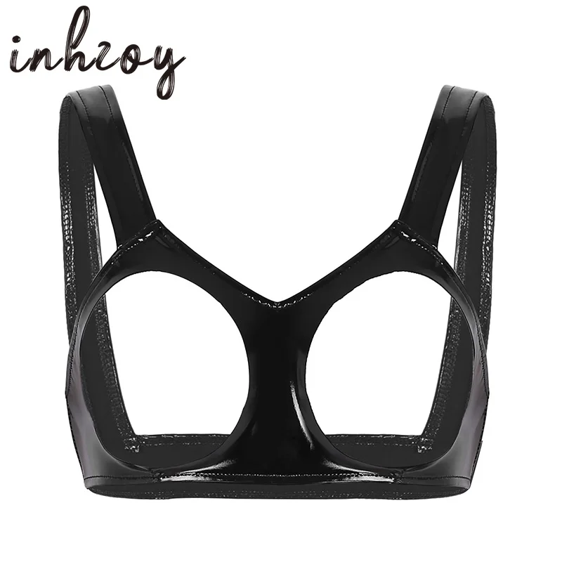 Женское сексуальное нижнее белье из искусственной кожи, черный бюстгальтер без рукавов открытые чашечки, нижнее белье, майка, короткий топ, ночное белье, Клубные бюстгальтеры, топы