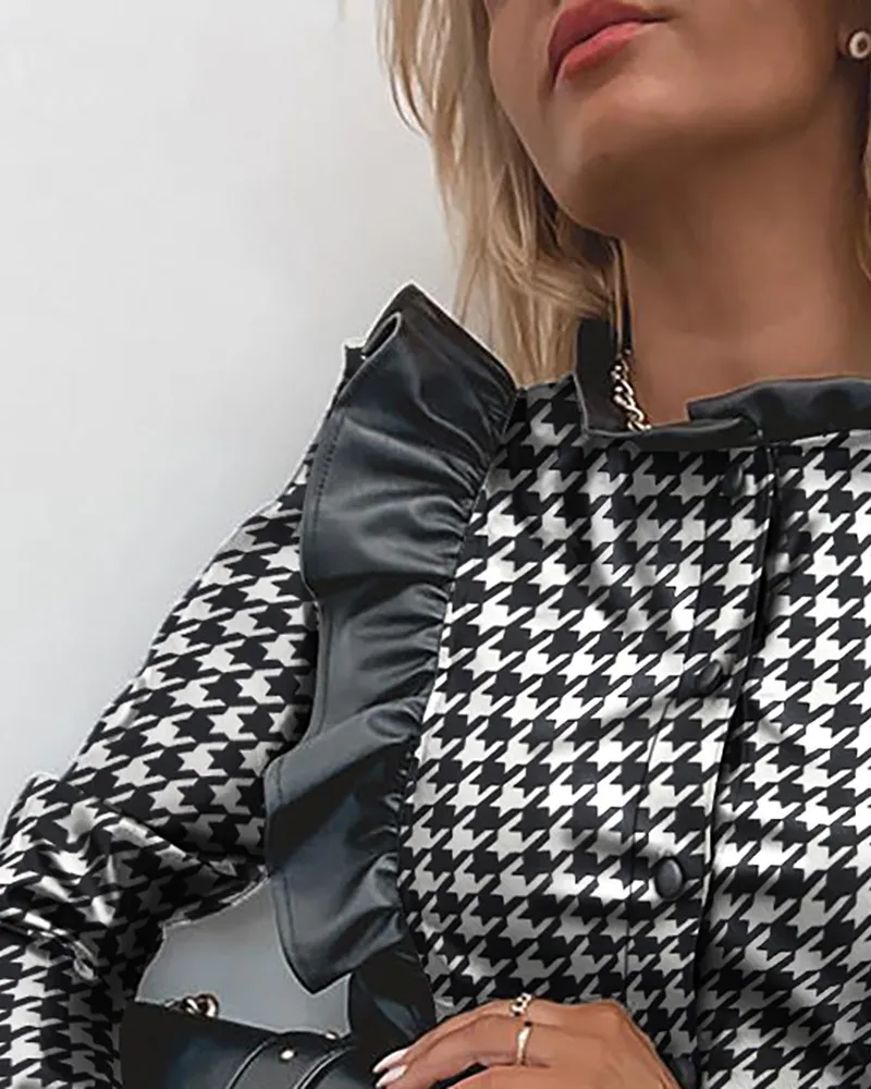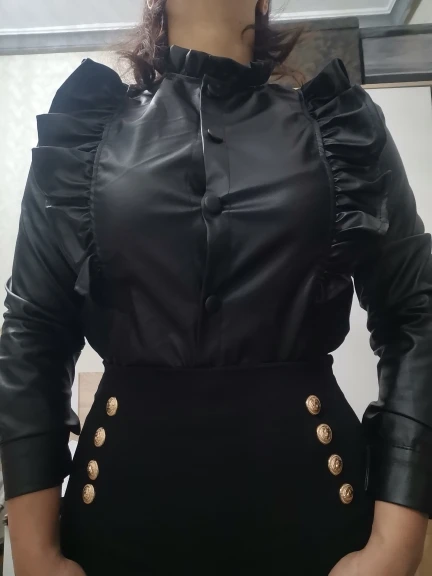 Женская офисная блузка из искусственной кожи, оборки, длинный рукав, кружевная оборка, круглый вырез, облегающие топы, блузки из ПУ, Осень-зима
