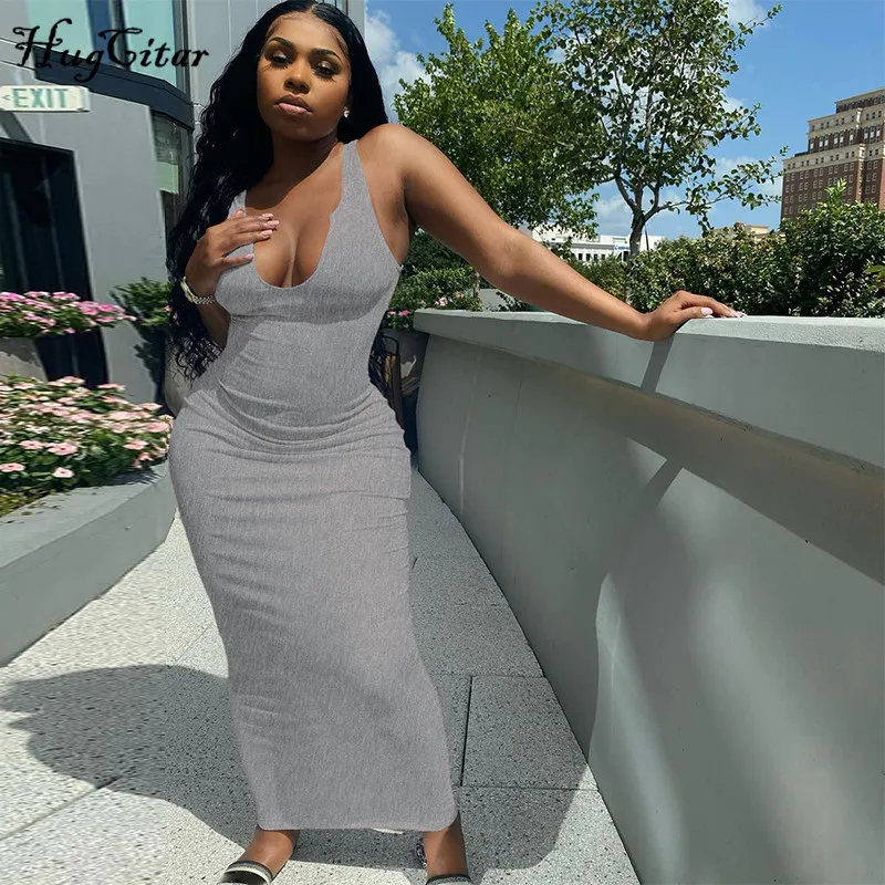 Hugcitar2021 однотонное обтягивающее платье макси без рукавов с квадратным воротником в рубчик; Сезон весна-лето; Женская модная пикантная уличная одежда для отдыха
