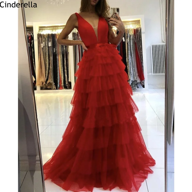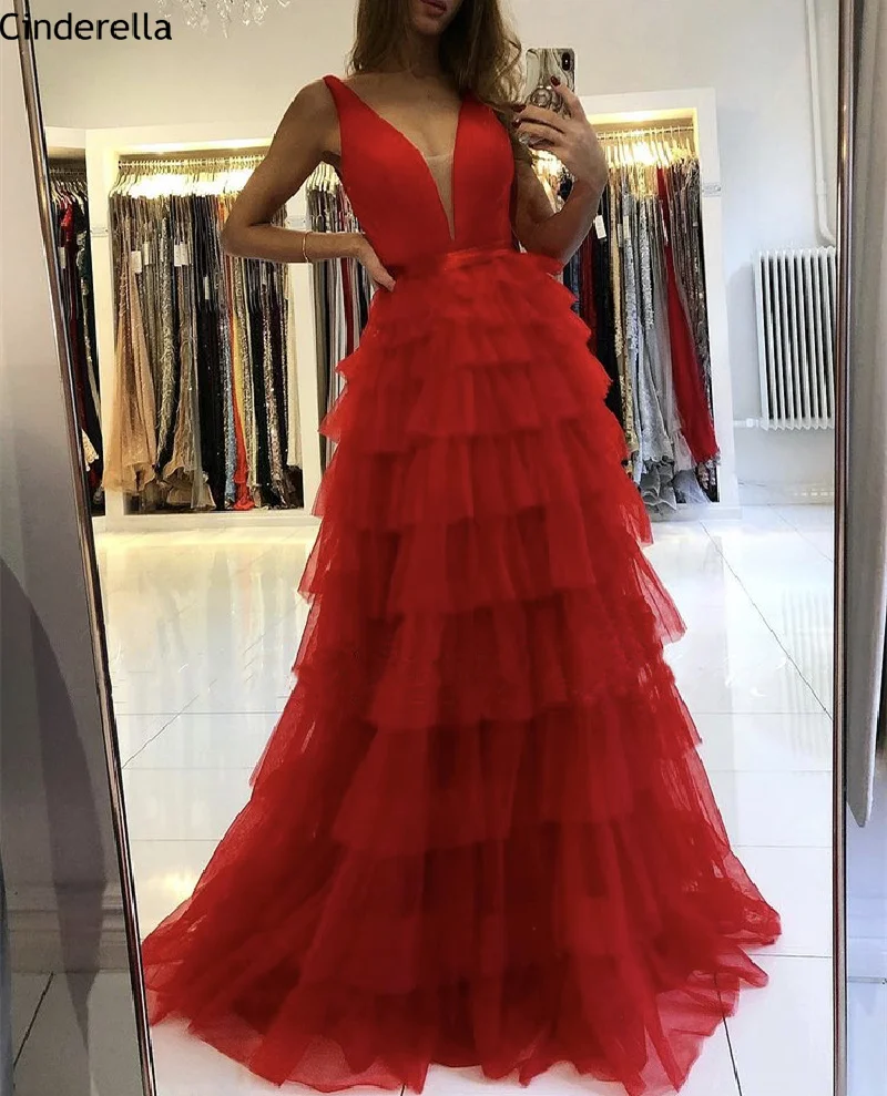 Красное платье для выпускного вечера с V-образным вырезом, плиссированное Тюлевое платье для выпускного вечера до пола без рукавов со шнуровкой