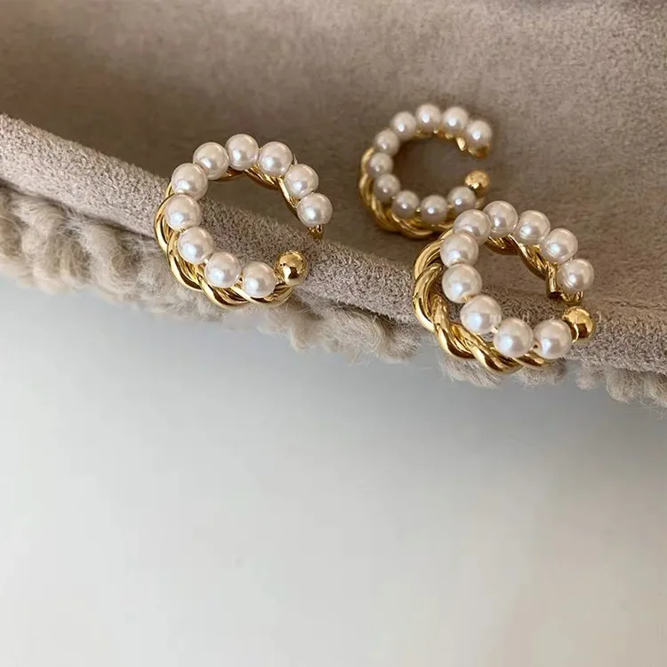 Серьги-каффы золотого цвета с двойным кругом и жемчугом, винтажные геометрические кольца, имитация пирсинга, жемчужные клипсы