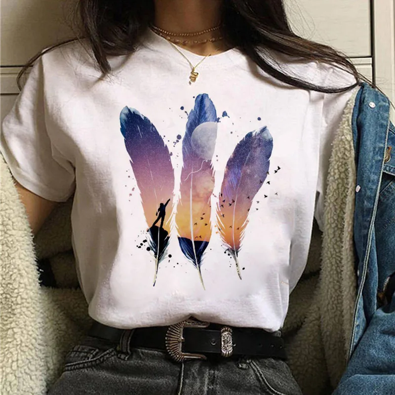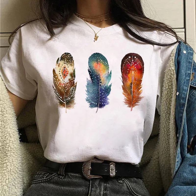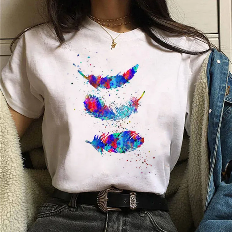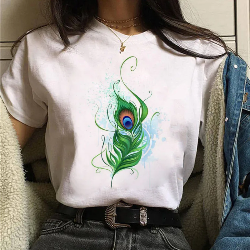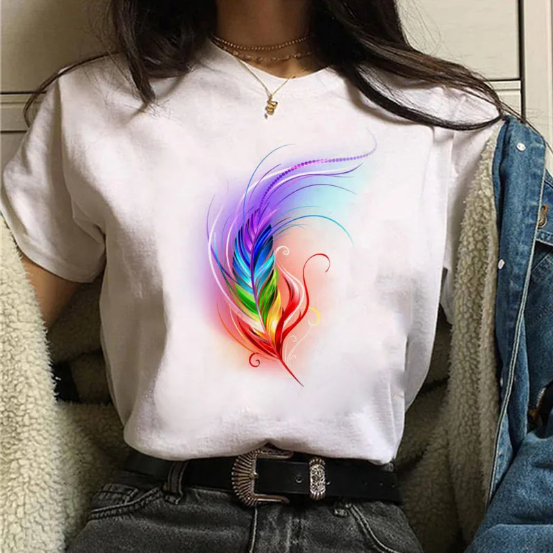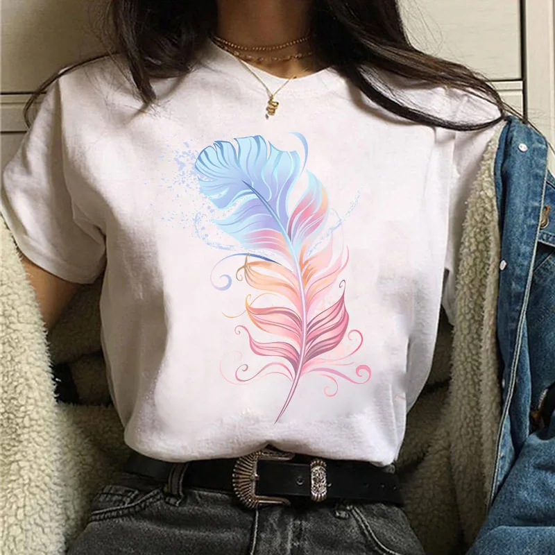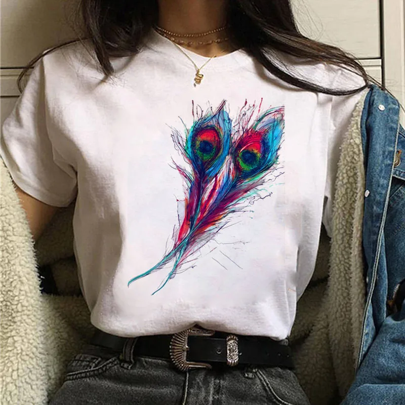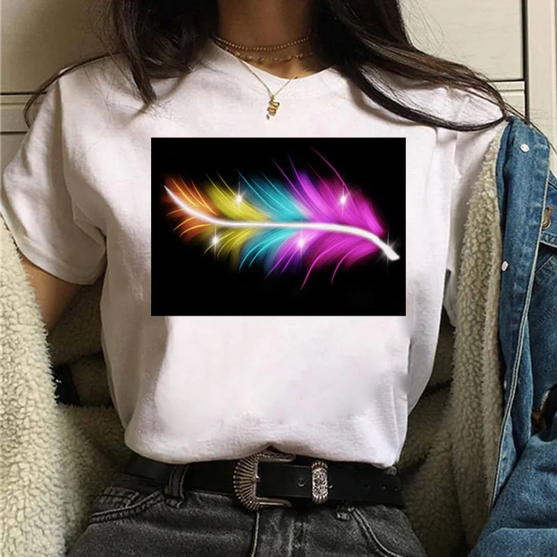 Новая футболка с принтом перьев, модная женская футболка, футболки с графическим рисунком в стиле Харадзюку, женские летние милые топы, Женская белая футболка с мультяшным рисунком