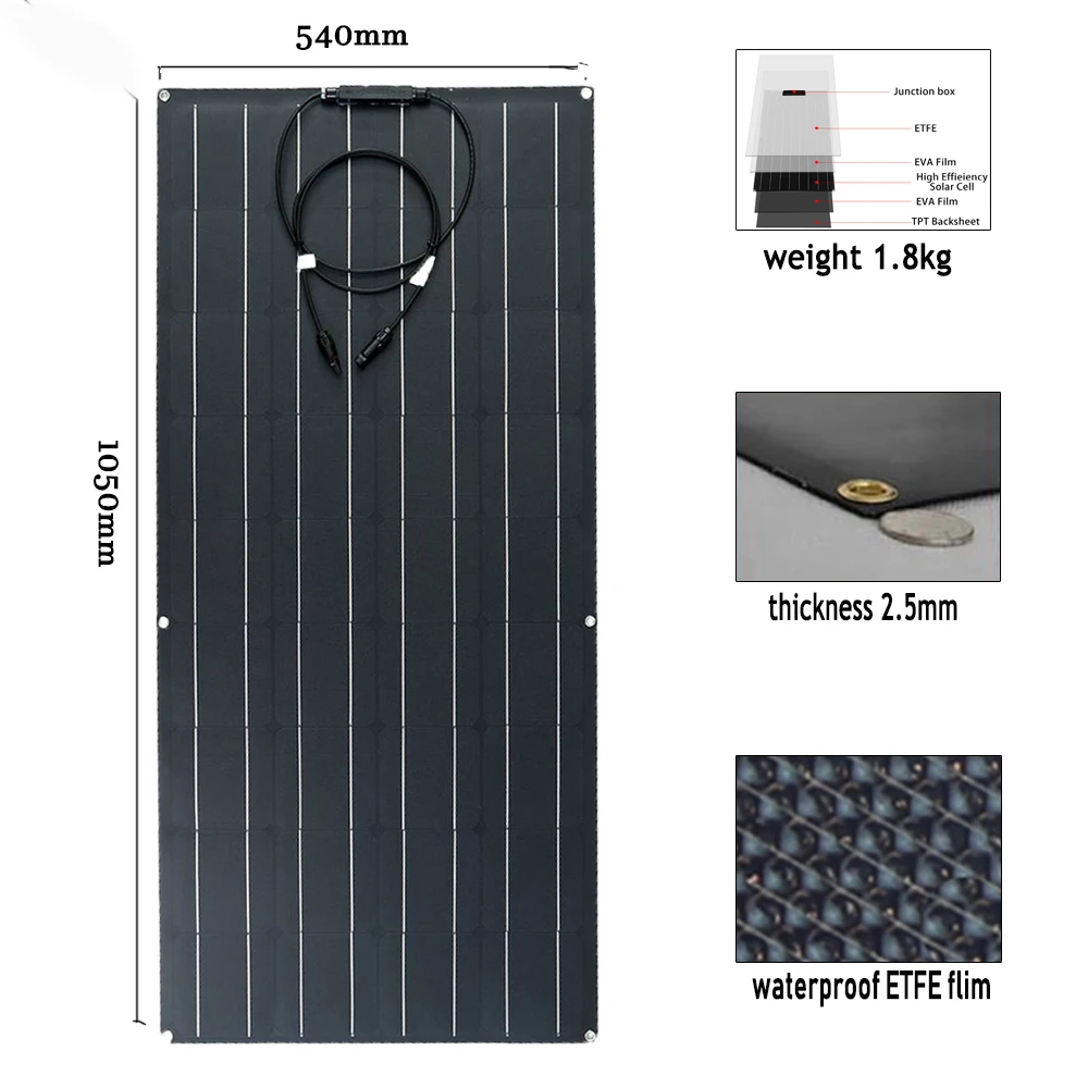Эта высокая эффективность 100 Вт Гибкая Водонепроницаемая монокристаллическая солнечная панель идеально подходит для постоянного использования на открытом воздухе для обеспечения бесплатного электричества для зарядки батарей 12 В для питания различных приложений, таких как дома на колесах, караван, кемпер, лодки, или для систем солнечного освещения, автономных и резервных систем солнечной энергии. Контактные солнечные элементы сЭффективность до 22%Эта панель идеально подходит для применения там, где пространство ограничено, или там, где есть препятствия на крыше. Панель также может использоваться для обеспечения прямого источника питания для приложений, не чувствительных к изменениям входного напряжения/тока (например, электродвигателей или насосов) и для различных приложений сетки.