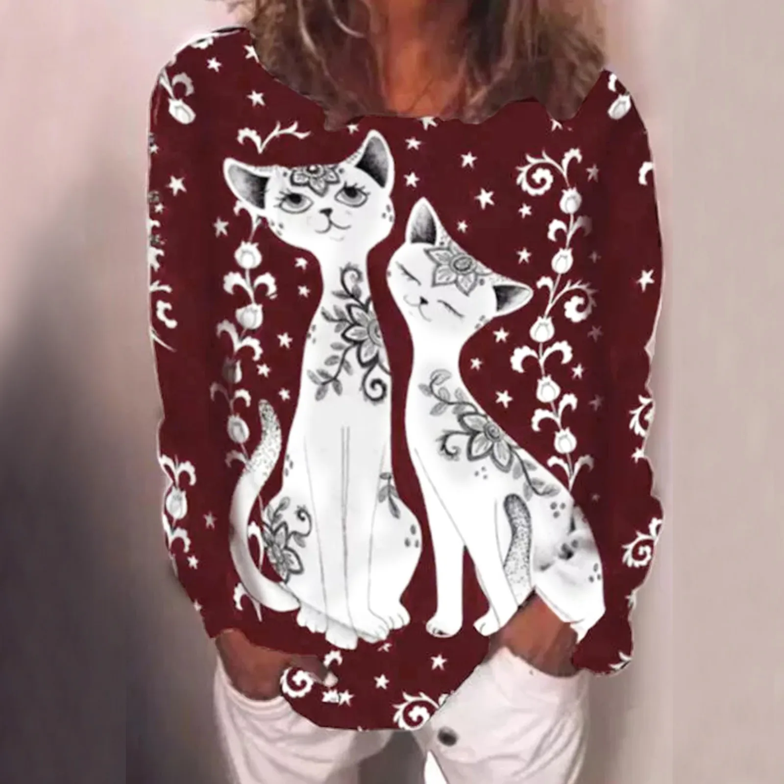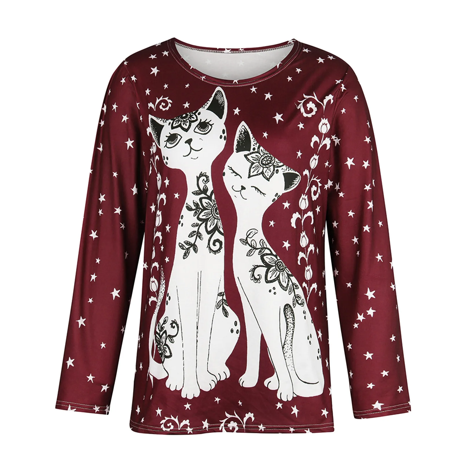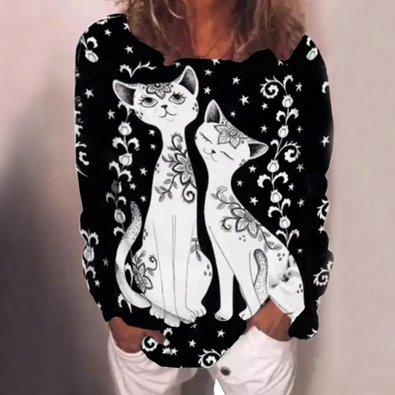 Размера плюс футболки для женщин с длинным рукавом 3D животного с принтом кота; О до образный вырез; Футболка, Т-футболка милый элегантный пуловер футболки женские футболки