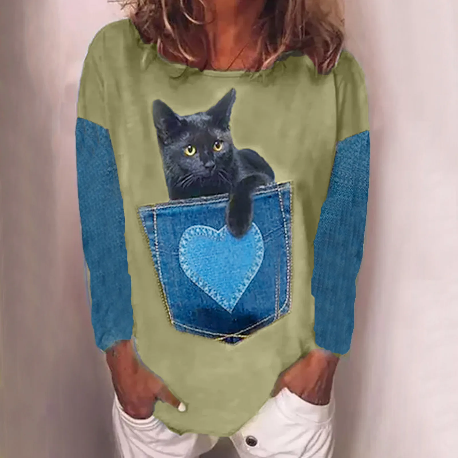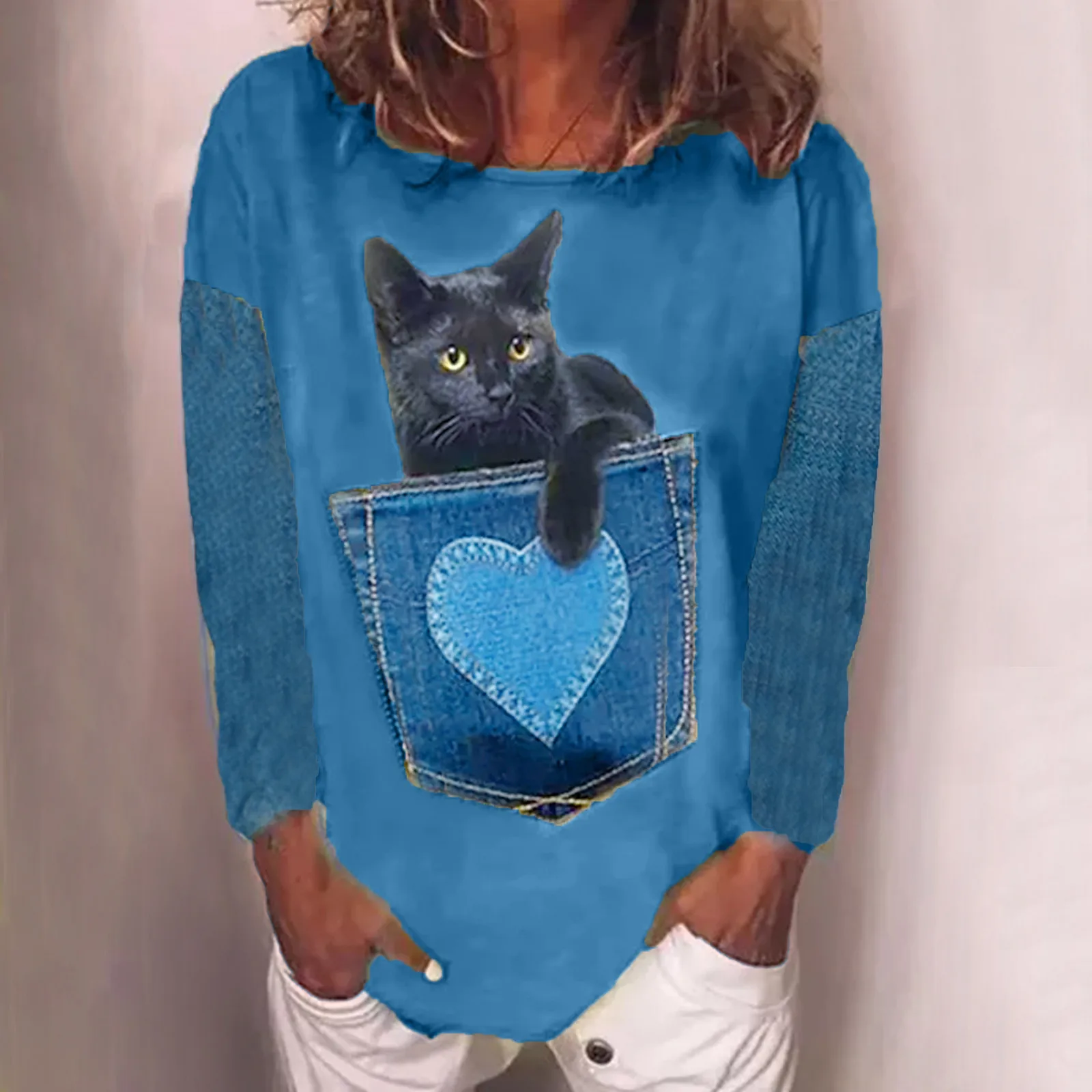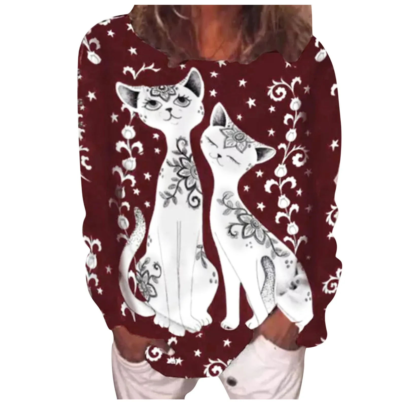 Размера плюс футболки для женщин с длинным рукавом 3D животного с принтом кота; О до образный вырез; Футболка, Т-футболка милый элегантный пуловер футболки женские футболки
