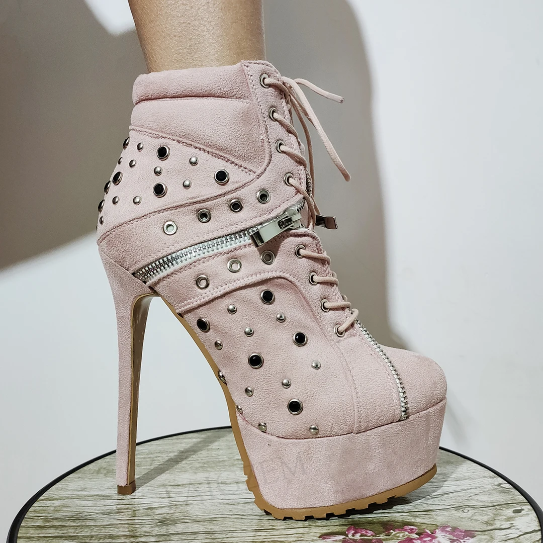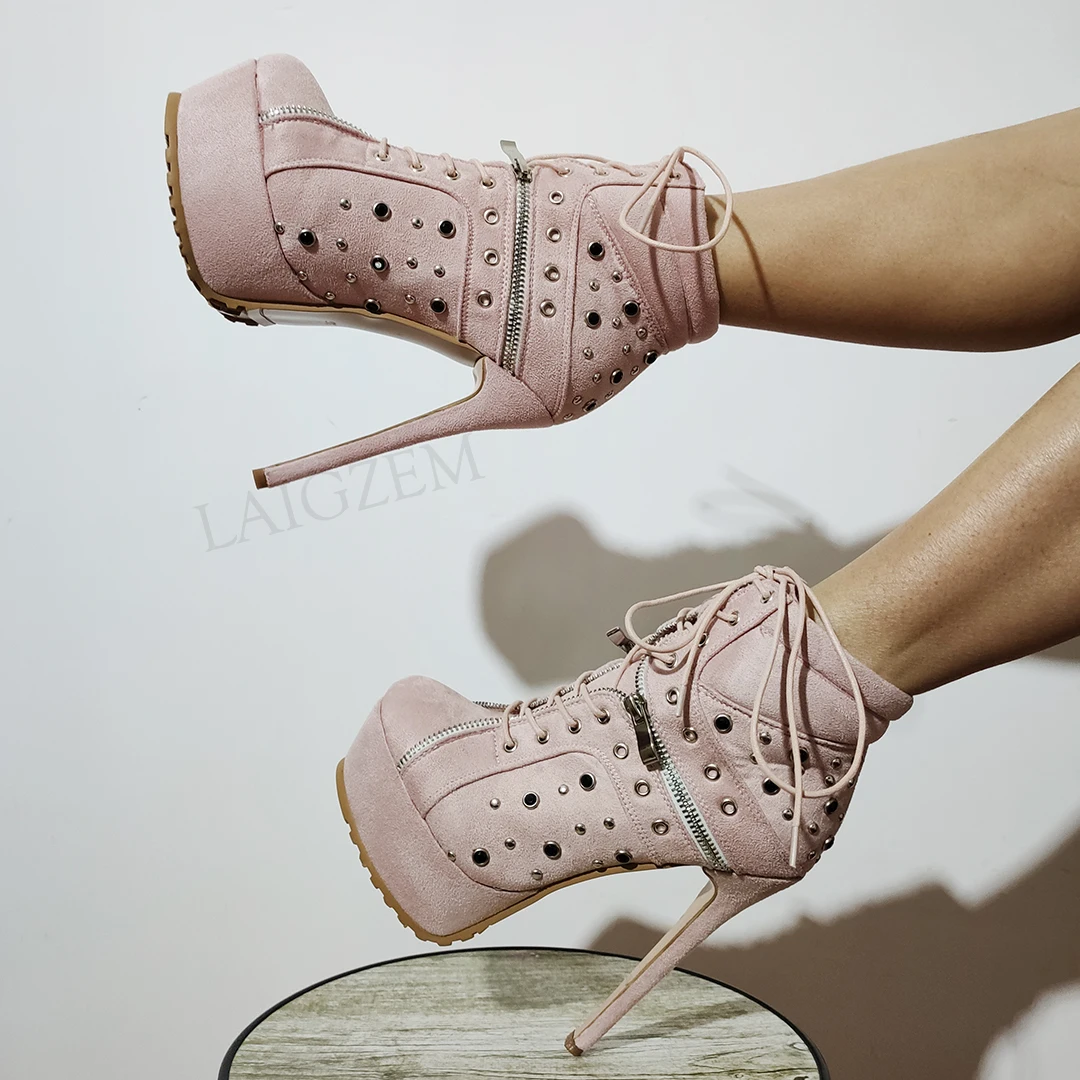 LAIGZEM женские ботильоны на платформе с заклепками, сапоги на тонких высоких каблуках ботинки на шнуровке, из искусственной замши, полуботинки со шнуровкой, зимняя обувь женские зимние сапоги большого Размеры размеры 38-44, 47 (Европа)