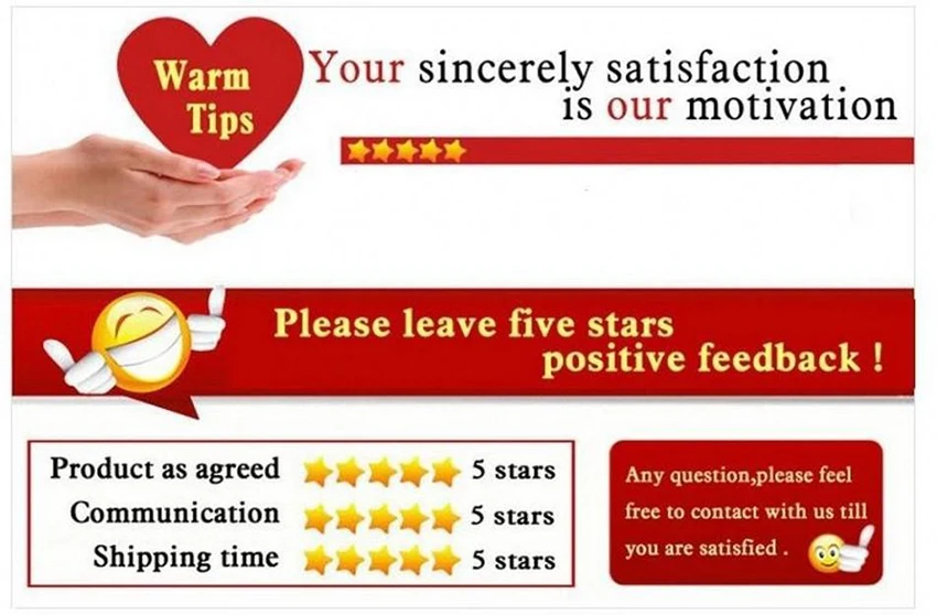Если вам нравятся наши продукты, пожалуйста, дайте нам положительный рейтинг (пять звезд), если у вас есть какие-либо проблемы, пожалуйста, сначала свяжитесь с нами, мы будем активно сотрудничать с вами, чтобы решить проблему.