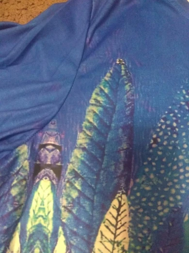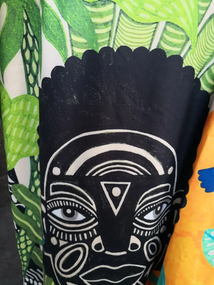 Ткань ожидала более хлопчатобумажного типа, принт не такой интенсивный, как на фото. Вырезать слишком широко.