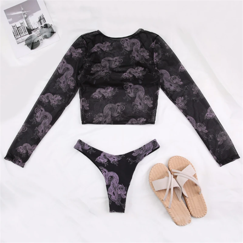 Бикини женское GNIM, из 3 предметов, прозрачная сетчатая накидка, купальник, женский купальник с принтом, бикини, 2021