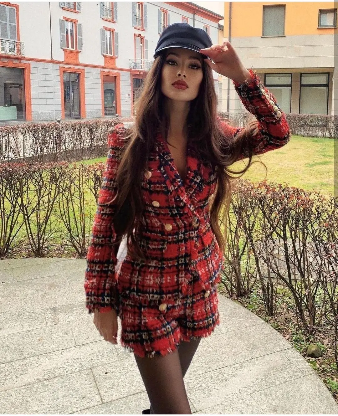 Женские короткие костюмы, Красный Клетчатый твидовый Блейзер и шорт...