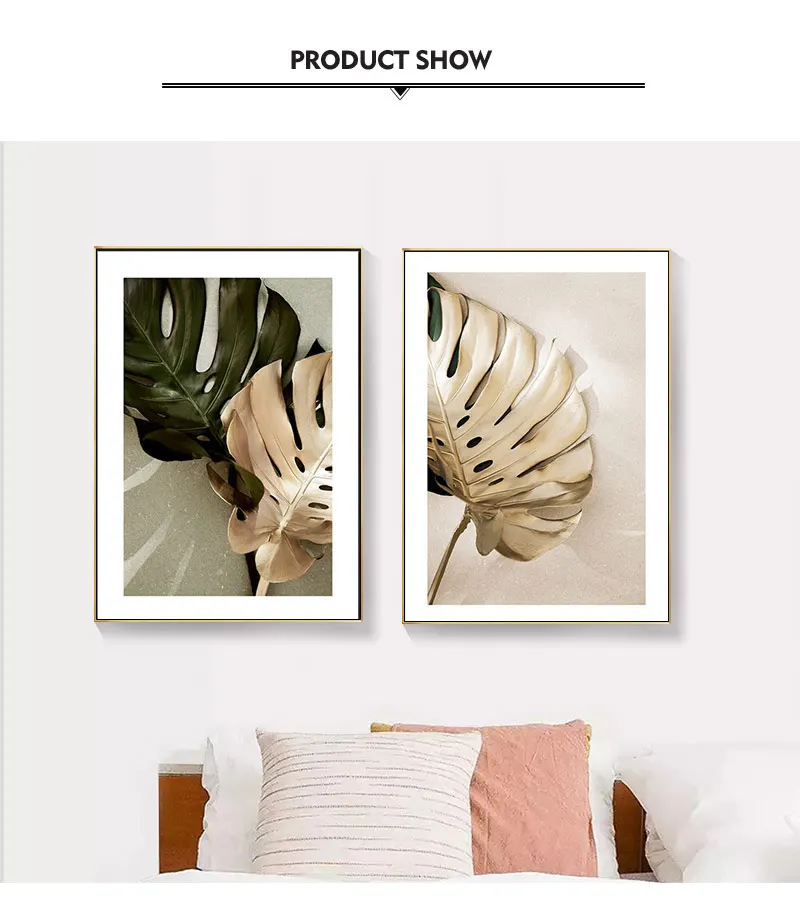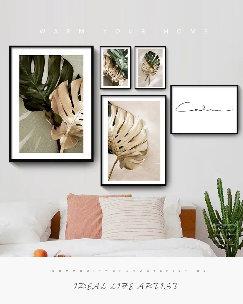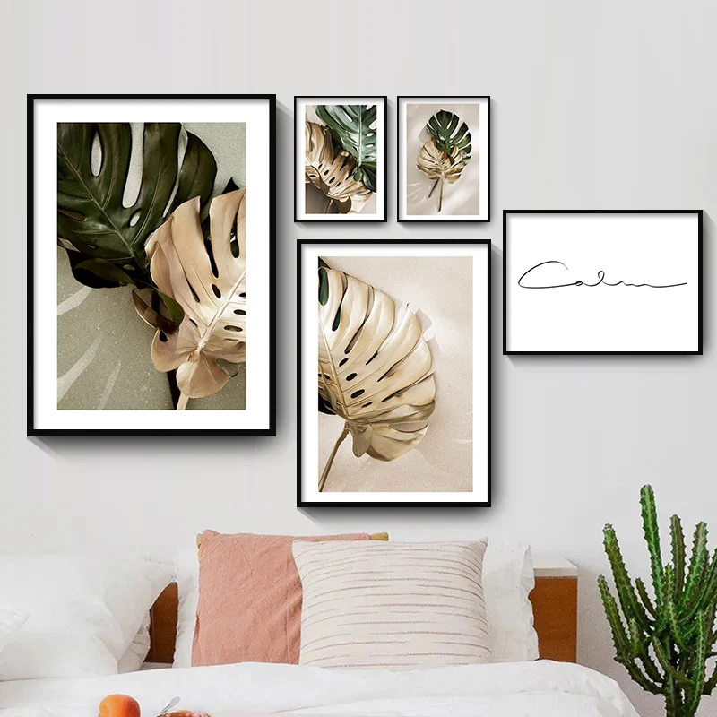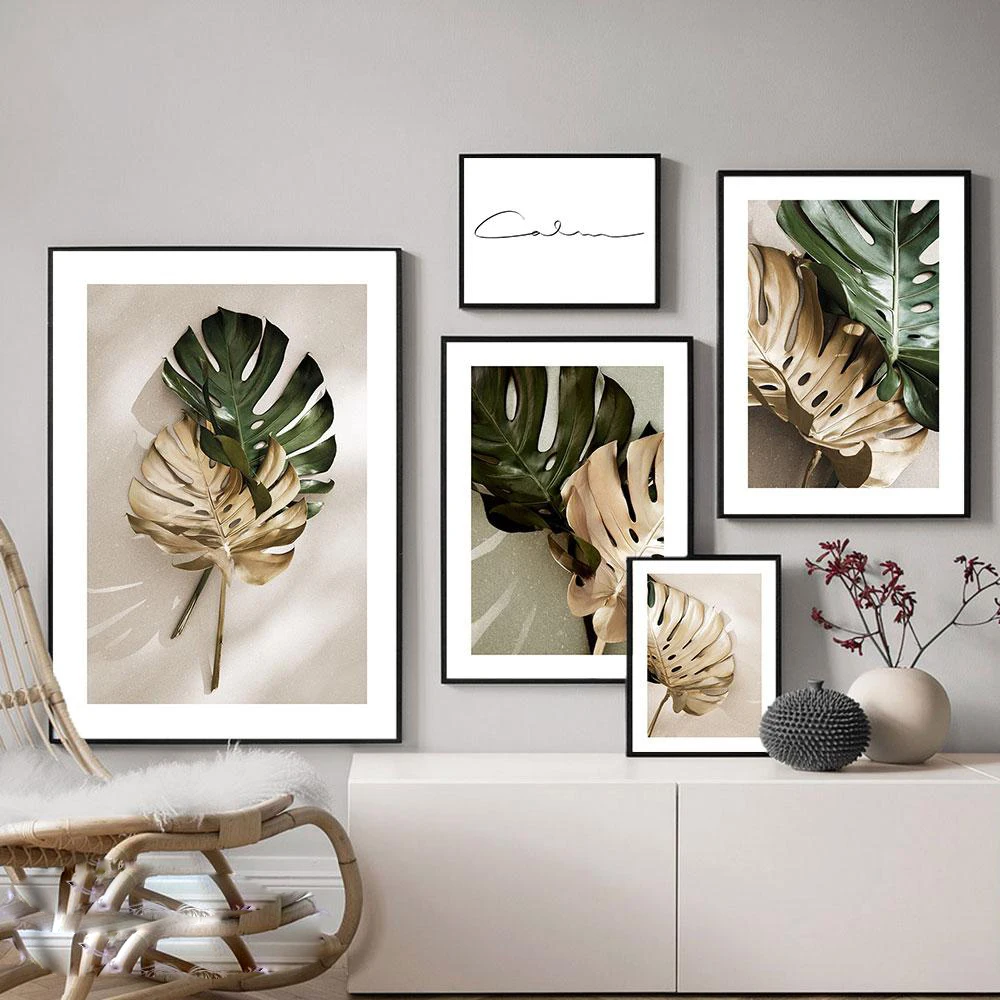 Картина на холсте с зелеными и золотыми листьями, скандинавский постер и печать на стене в скандинавском стиле, декор для гостиной