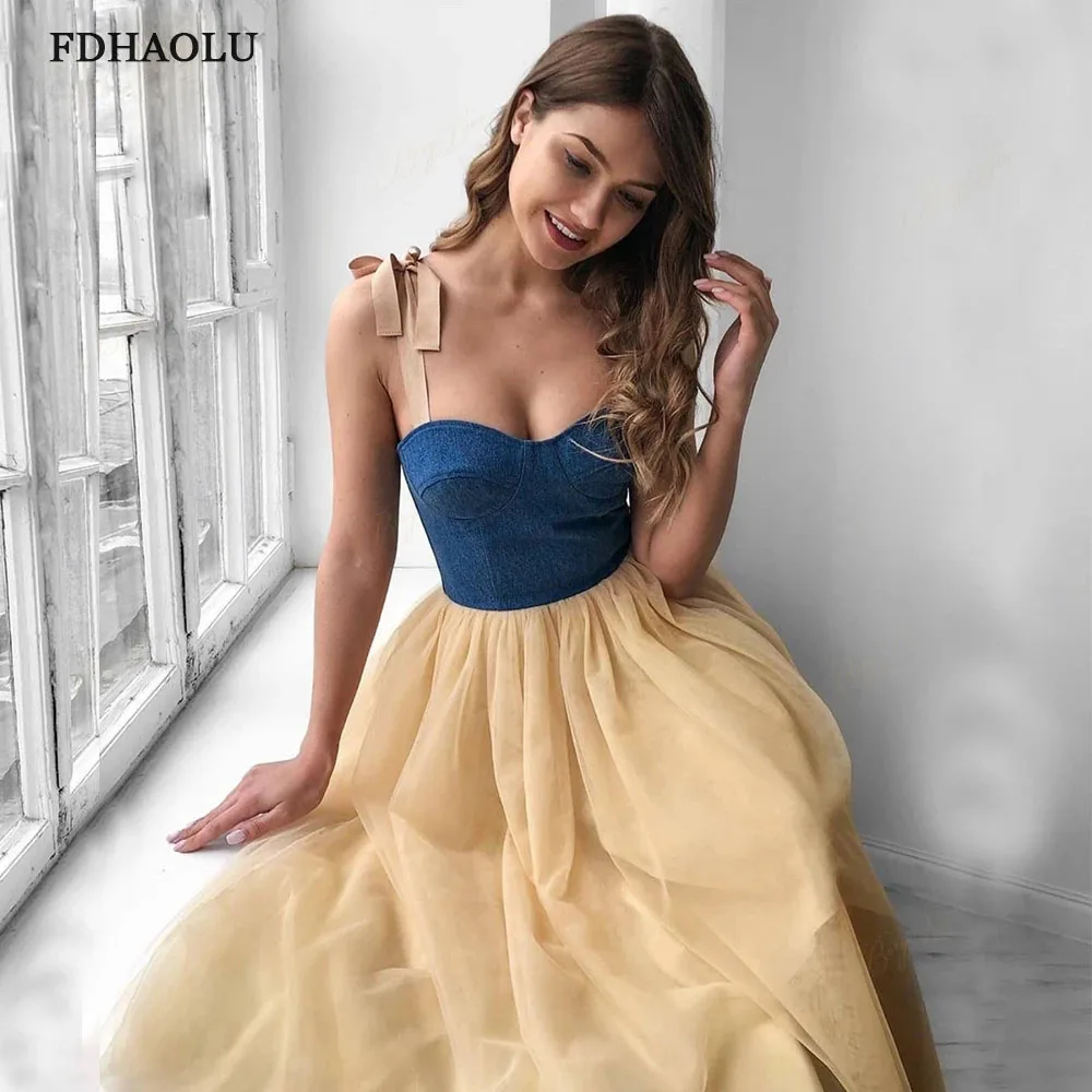 FDHAOLU FU106 Выпускные платья милое на тонких бретельках джинсовое Тюлевое вечернее платье длиной до колена вечерние платья размера плюс