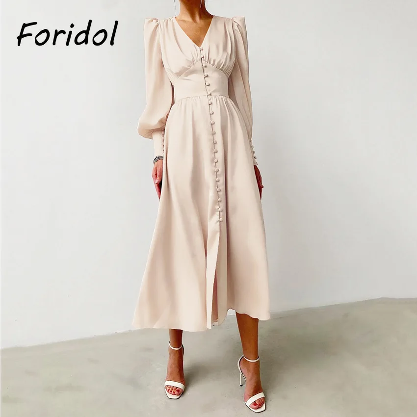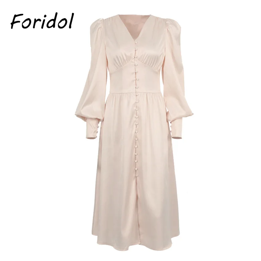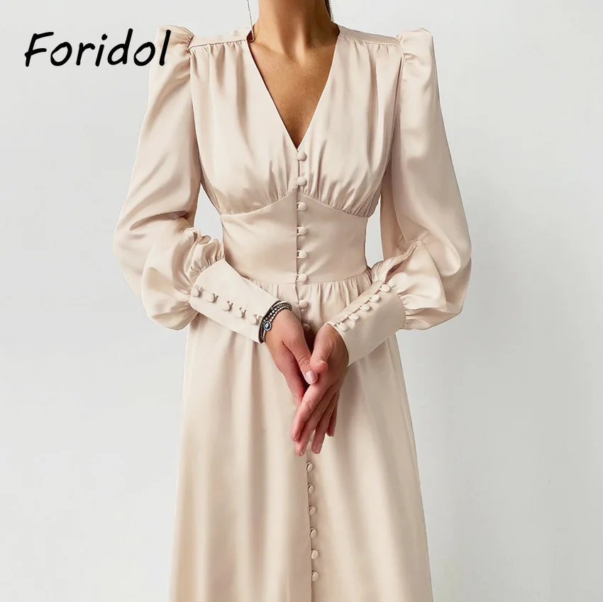 Foridol Фонарь рукавом атласная винтажное длинное платье для женщин на пуговицах Элегантное длинное шелковое платье вечерние платья; Сезон весна-осень; Женские модельные туфли