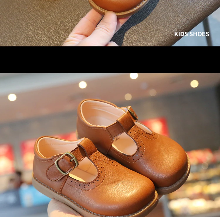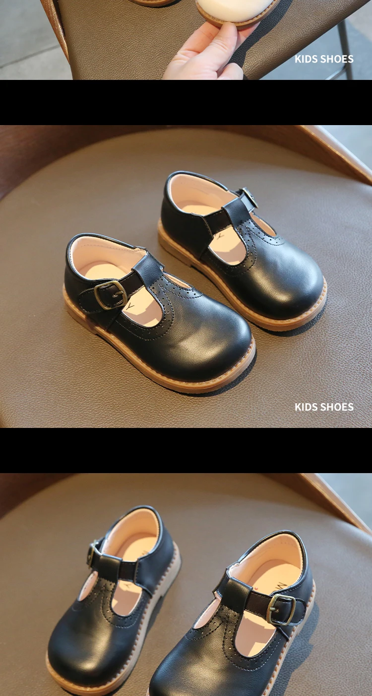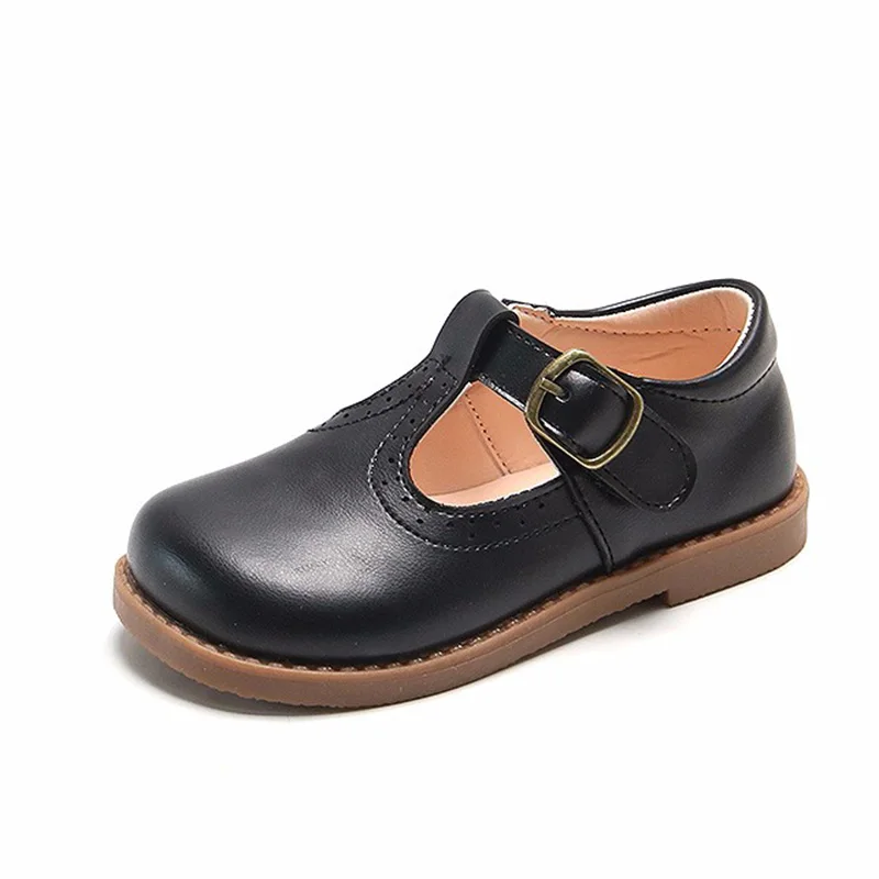 Туфли для девочек, кожаные, черные, коричневые, с Т-образным ремешком и пряжкой