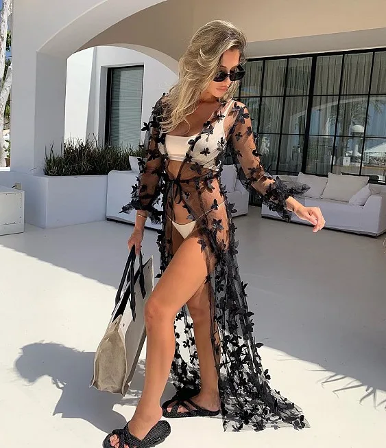Женский Длинный сетчатый купальник, накидка, сексуальное кимоно с открытой спереди и 3D бабочками, кардиган, пляжная одежда, праздничная накидка-бикини